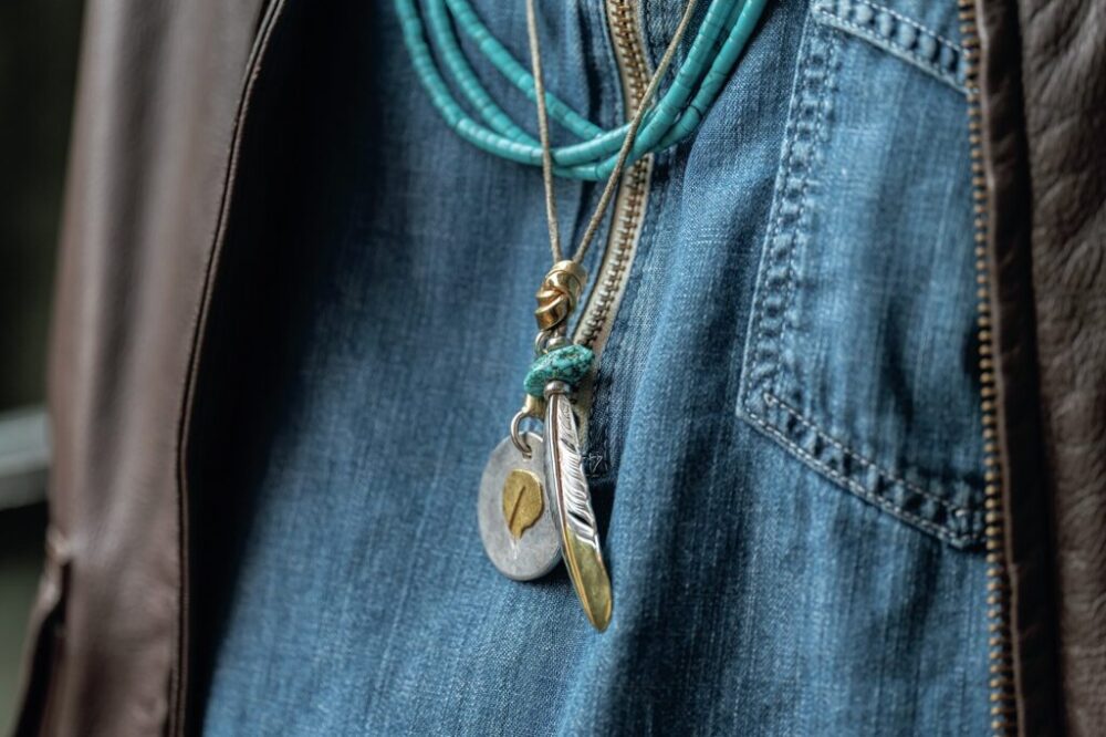 取材時の林田さんの胸元には、ネイティブアメリカンの職人が手掛けたターコイズビーズのネックレスとラリースミスのアイコニックなフェザーやメタルを重ね付けしていた。この感覚が氏の真骨頂だ。