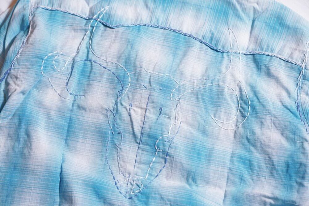 アメリカを代表する女性画家ジョージア・オキーフの作品をイメージした、スカル柄の刺繍が背中と、両胸ポケットに配されている。