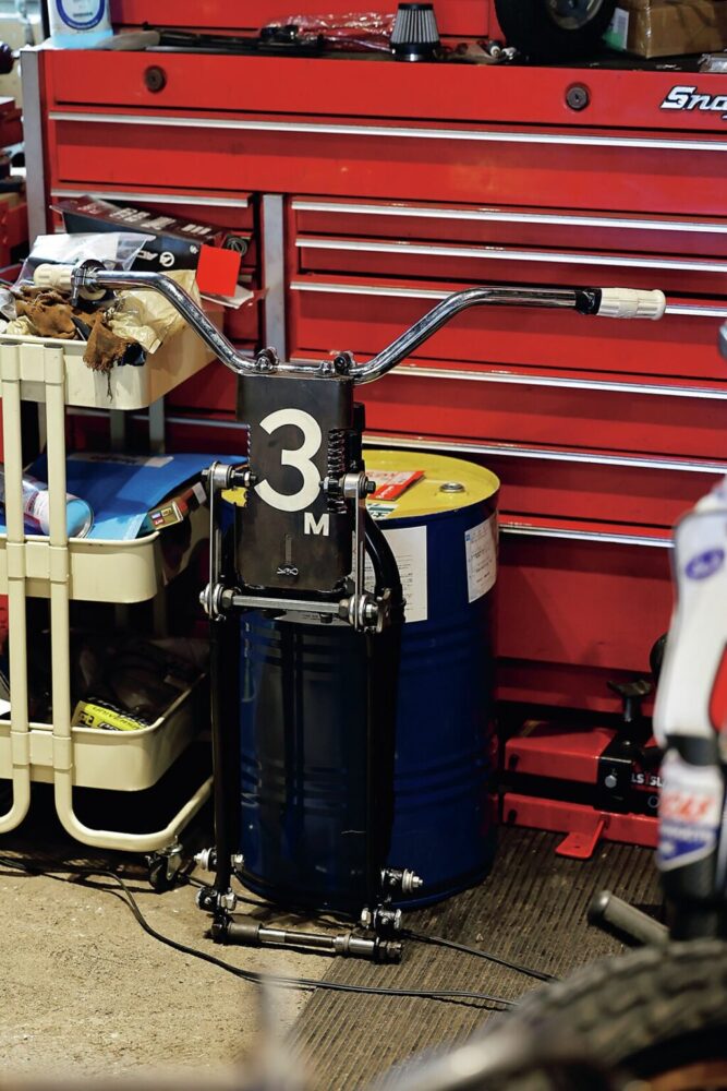 伊藤さんの人生において何かと縁があり、これまでと同じく「3」のゼッケンをつけたハンドルとフロントフォークはいずれレースに出場する際に装着させるもの。