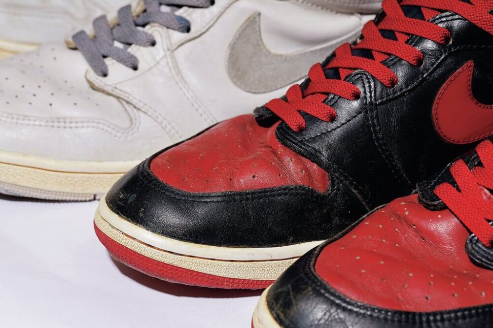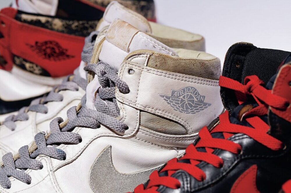 1985年製のオリジナルのジョーダン1を3年ほどかけて集めた堀内さん。当然、ソールのゴムは硬化しており、滑って履けるコンディションではなかったが、ソール交換が可能であることを知り3足とも依頼。正確にはここにはないブラック×ブルーもリペア中で撮影日には間に合わなかったという。ソール交換&メインテナンスにより新品のように息を吹き返したオリジナルのジョーダン1。
