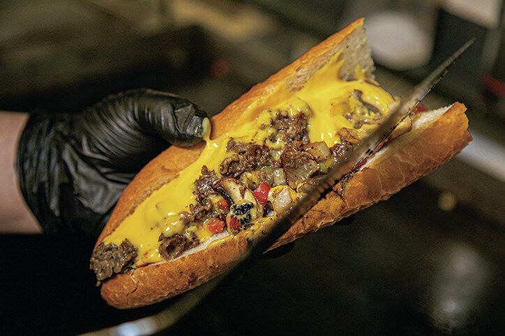 スライスしたビーフにマッシュルームやパプリカを加えてグリルする。そこにチェダー、モッツァレラ、ブルーチーズをブレンドしとろとろにしたものを乗せて、バゲットへイン! ヤミツキになる濃厚な味。