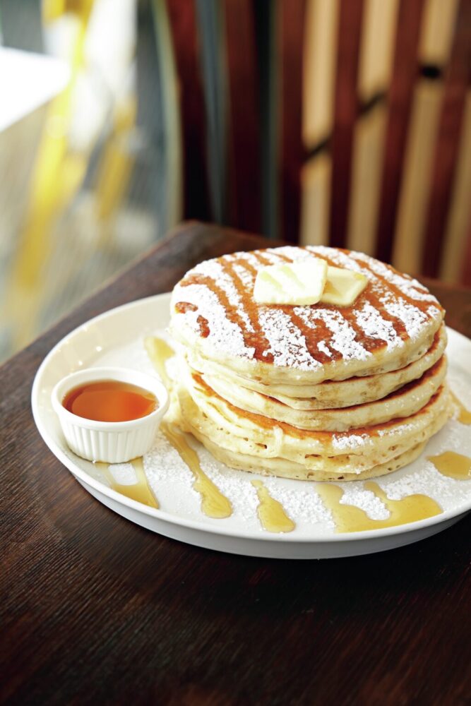 アメリカでは定番のバターミルクを使ったパンケーキ。ふわふわで軽いので、5枚でもペロリと食べられる。バターとメープルシロップをたっぷりと。1700円