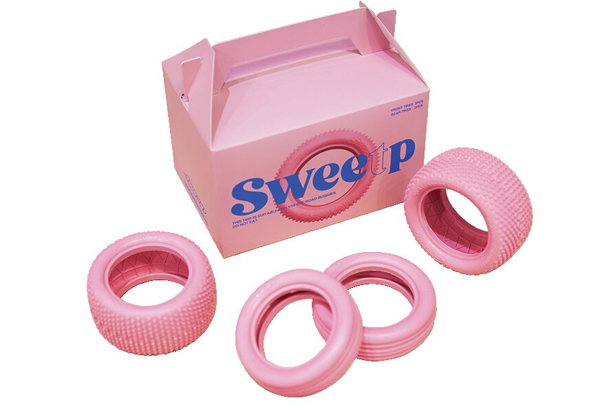 ピンク色のタイヤセット。「ピンクにしたらドーナツに見えてきて」この箱入りに。4620円