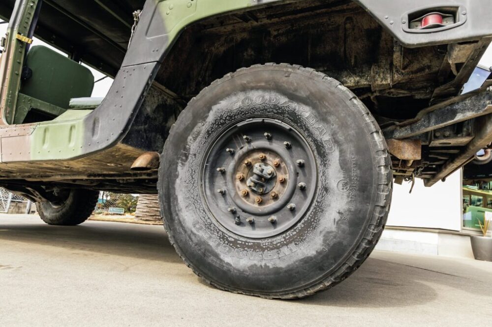 「武骨」という言葉を絵に描いたようなゴツいデザインのホイールに、37×12.5R16.5という特殊サイズのタイヤを装着。