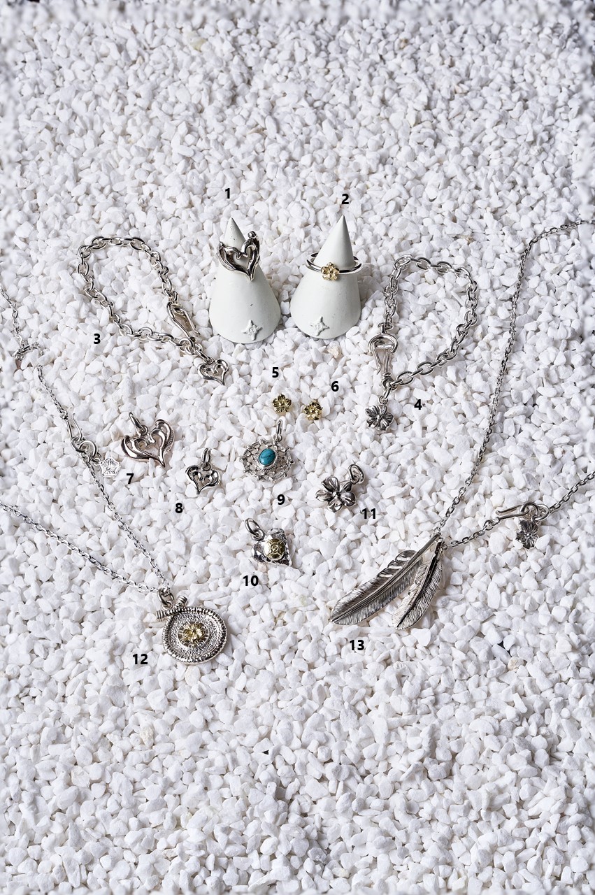 2023年より始まったプラチナシリーズに、今シーズンは新たにスターペンダントヘッド、フラワー、甲丸リングの3種が仲間入り。シルバーよりも黒みがかった色合いと、何より手にした時の重量感はシルバーやゴールドとも一線を隠す。その異彩を放つ存在感はぜひ店頭で手に取って味わってみてほしい。