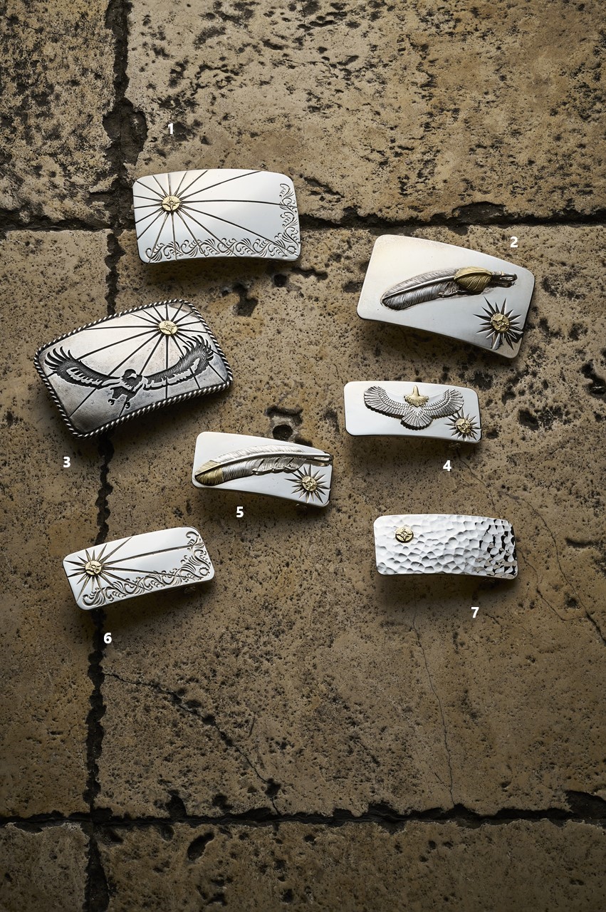 大ぶりで強烈なインパクトを放つバックルシリーズ。ちなみに使用するシルバーはアクセサリー加工に適する強度と輝きを併せ持つ950ブリタニアシルバー(銀95%、銅など5%)をメインに、強度を必要とする部位には925スターリングシルバー(銀92.5%)を使用することで美しさと強度を両立させている。