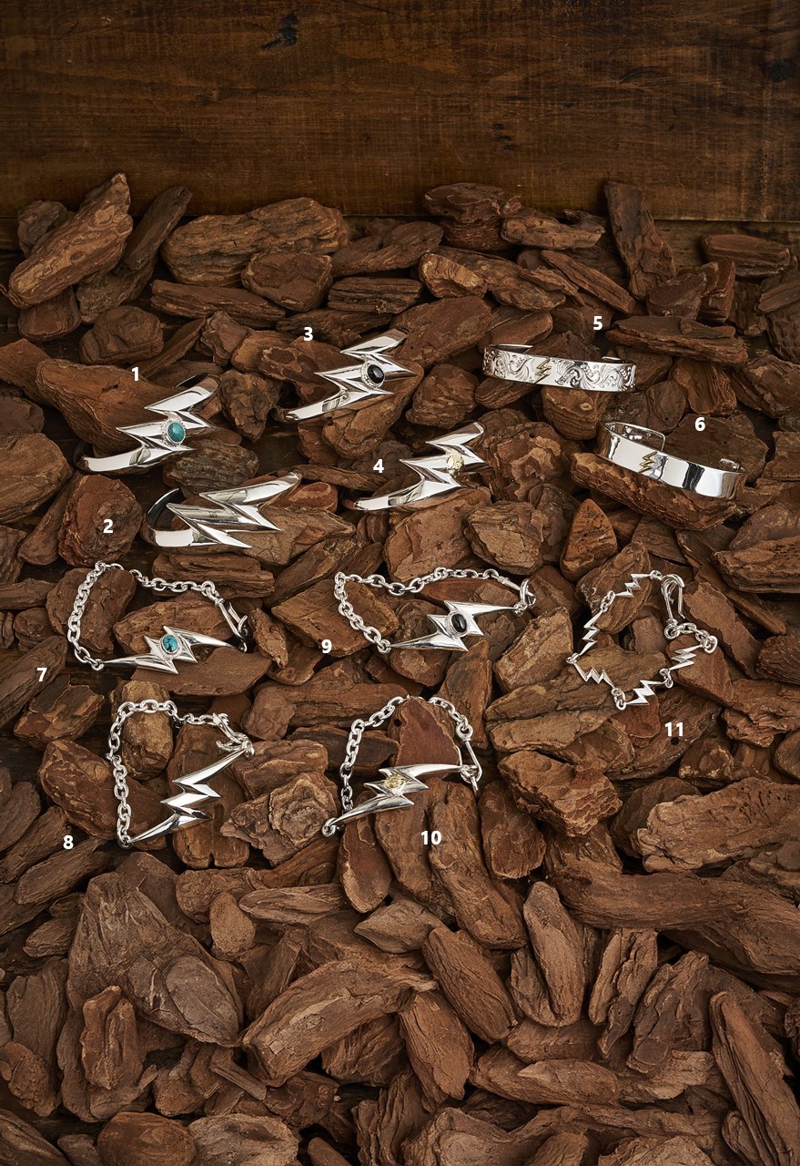 ネイティブアメリカンの間では「稲妻」はパワーとスピードの象徴、また、恵みの雨をもたらす幸福な存在として神聖視され、古くからアクセサリーのモチーフとしても用いられてきた。彼ら同様、ファーストアローズのライトニングシリーズもこれらの作品が身につける人の力になるよう祈りが込められている。