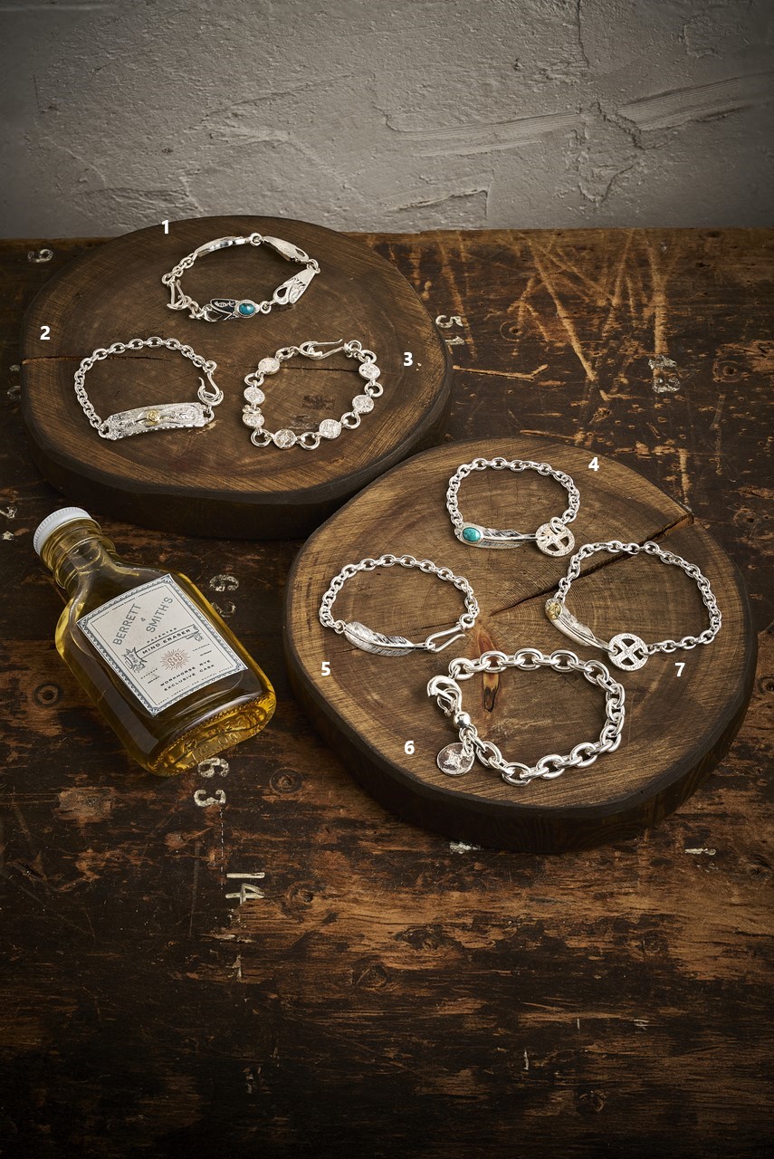 チェーンのパーツや装飾などによってエレガントにもワイルドにも演出できるブレスレット。バングルよりも控えめながら様々なスタイルに合わせられることから幅広い年代に人気がある。ちなみに、ファーストアローズのシルバー作品は全て「永久保証」が付く。