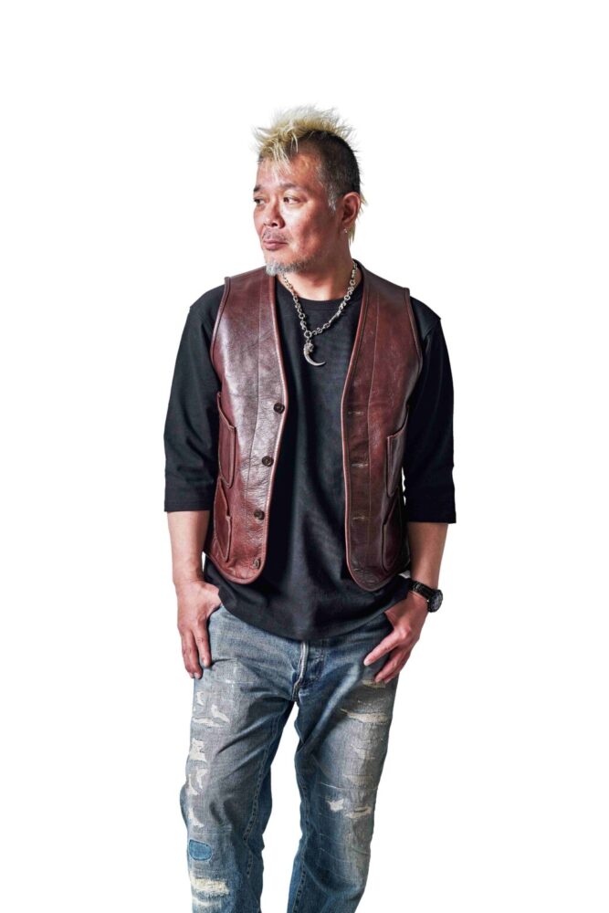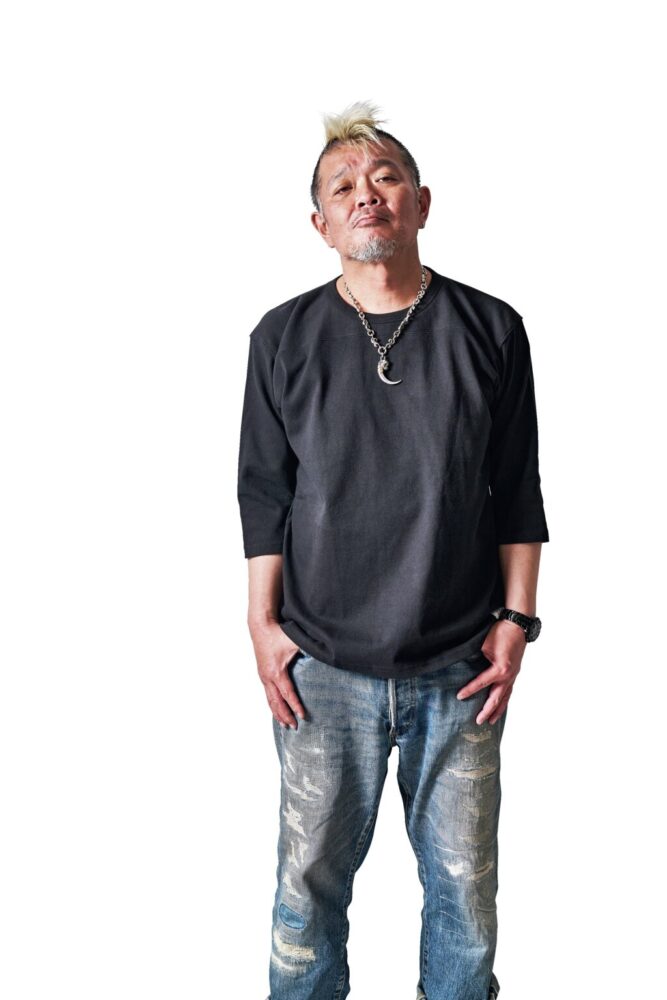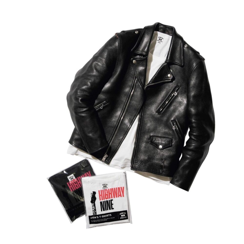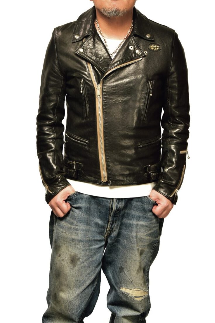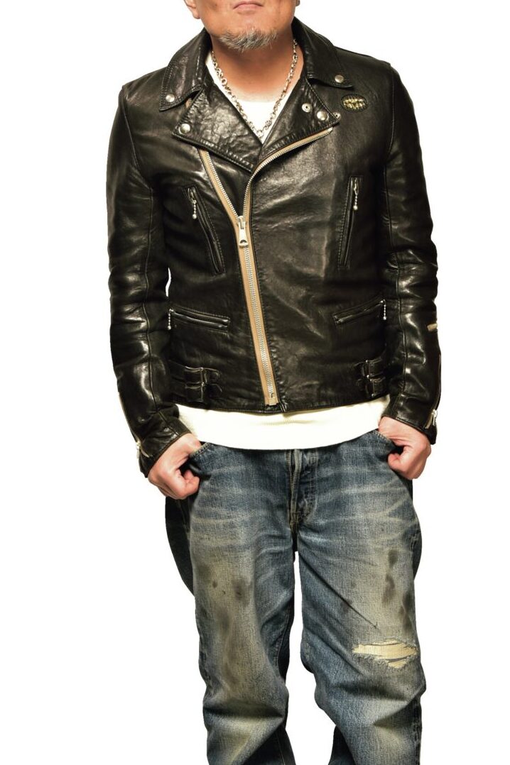 モヒカン小川の私物革ジャンとハイウェイナインを実際に合わせてみた。身長175㎝・体重70㎏のモヒ小川はリブTシャツのLサイズをチョイス。使用した革ジャンはリアルマッコイズのA-2、ショット・ワンスター、ルイスレザーズのライトニング。どう? 最高の着丈でしょ?
