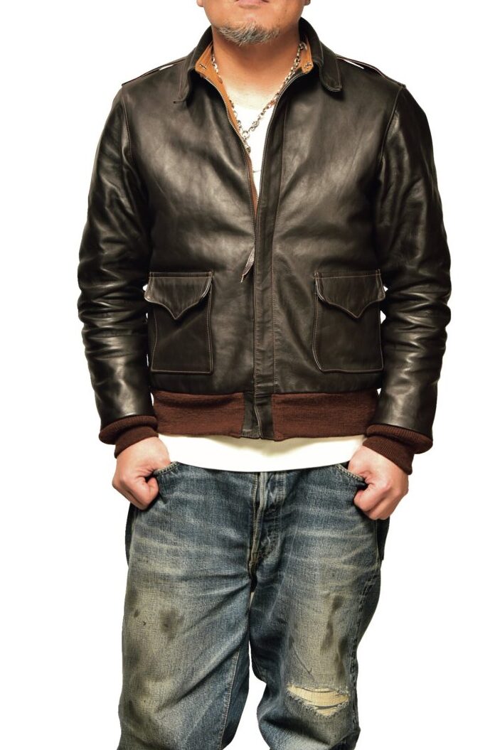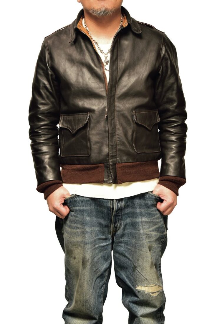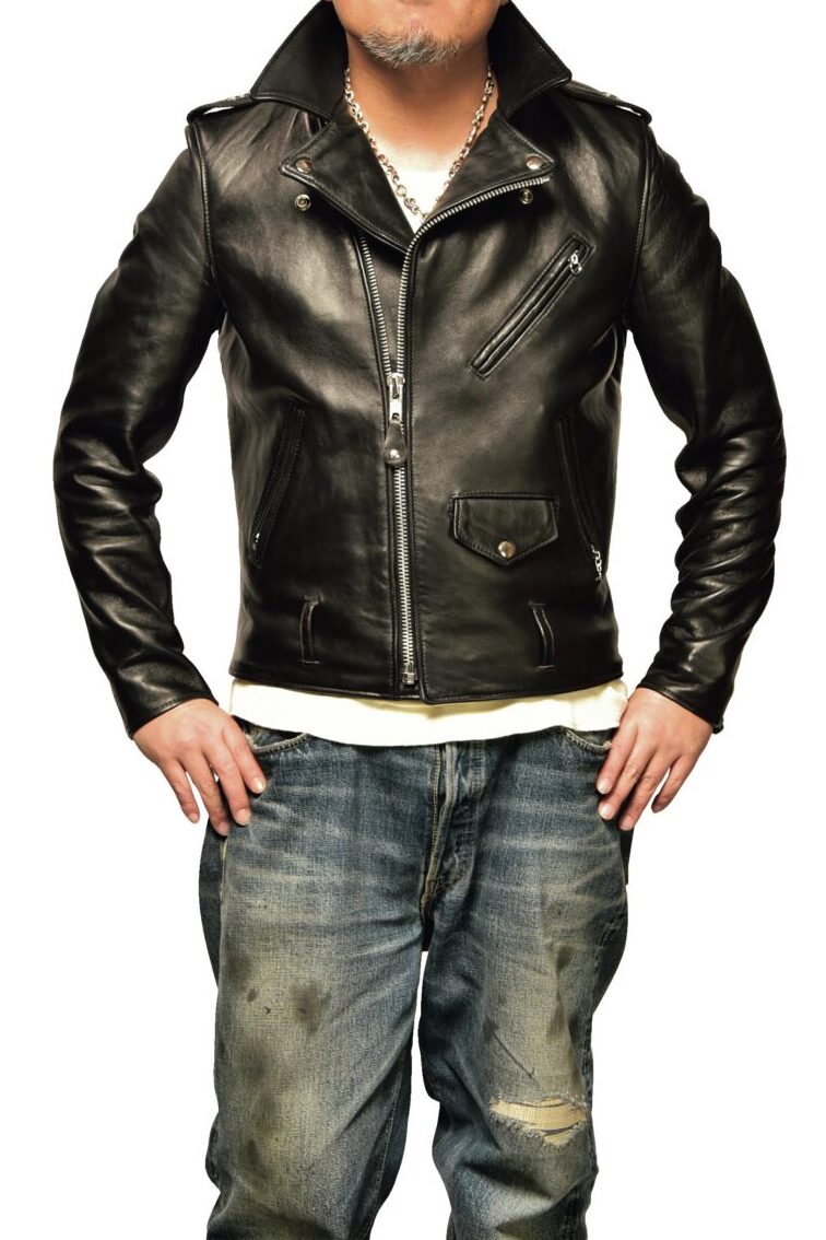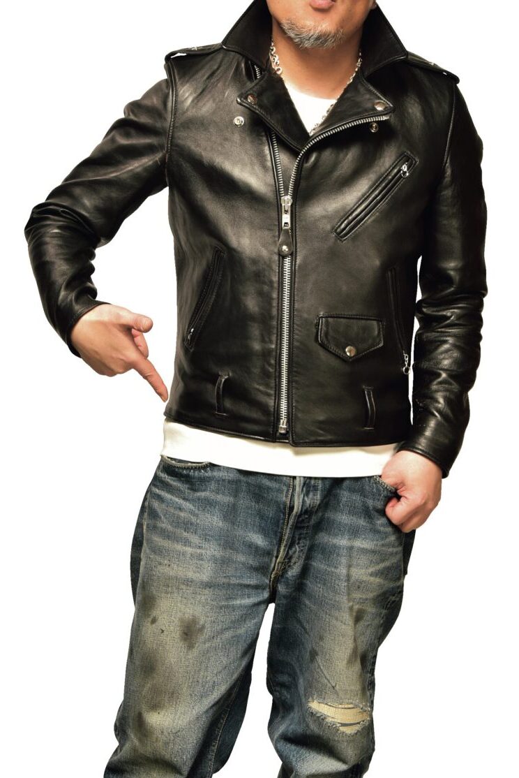 モヒカン小川の私物革ジャンとハイウェイナインを実際に合わせてみた。身長175㎝・体重70㎏のモヒ小川はリブTシャツのLサイズをチョイス。使用した革ジャンはリアルマッコイズのA-2、ショット・ワンスター、ルイスレザーズのライトニング。どう? 最高の着丈でしょ?