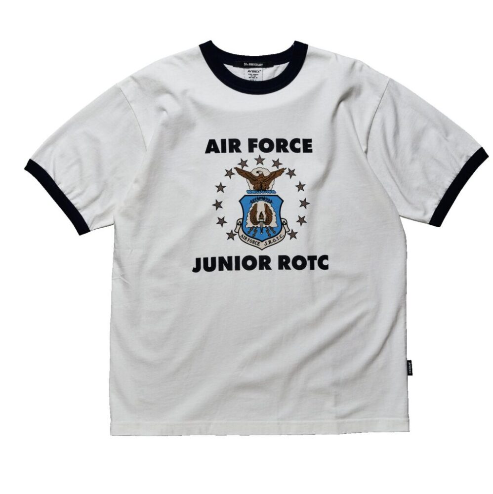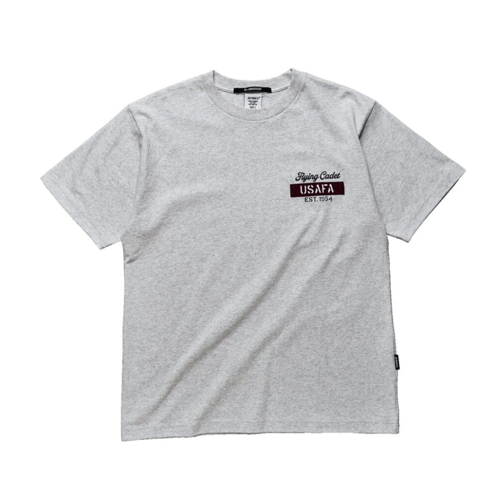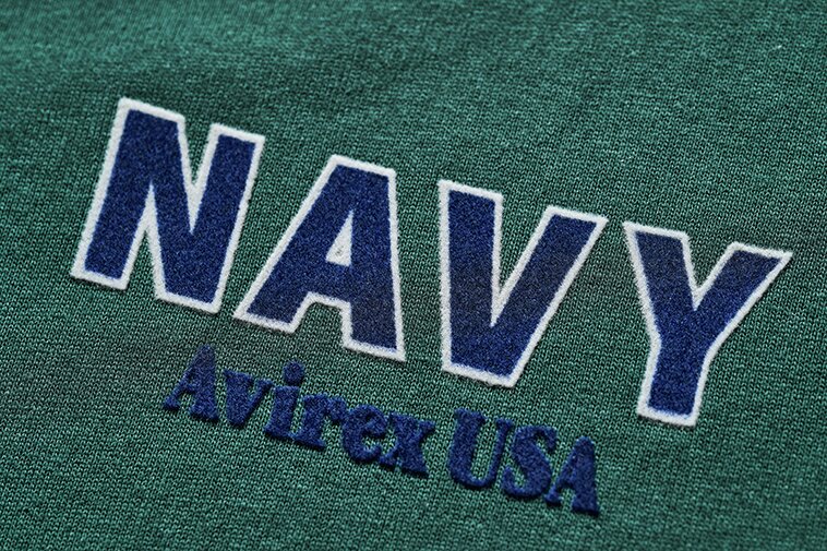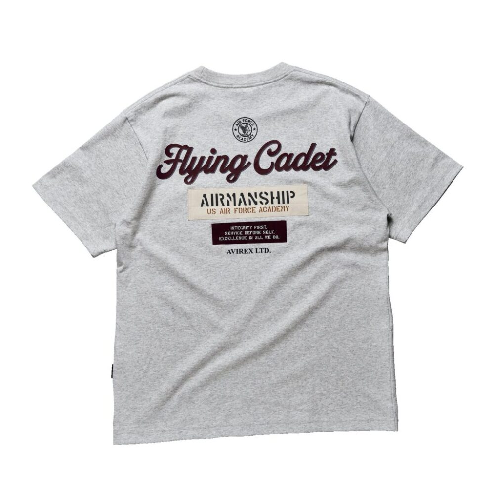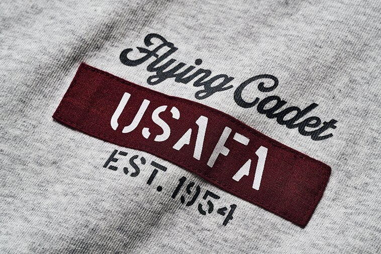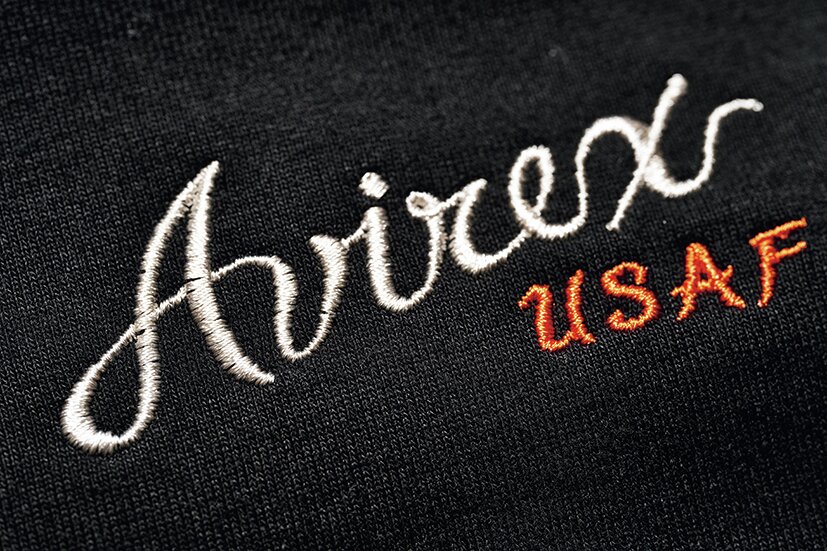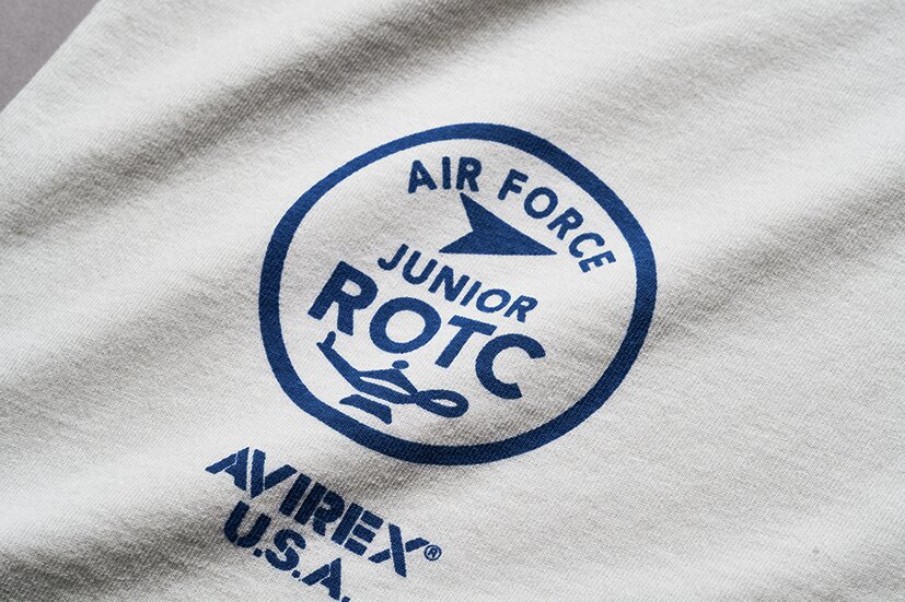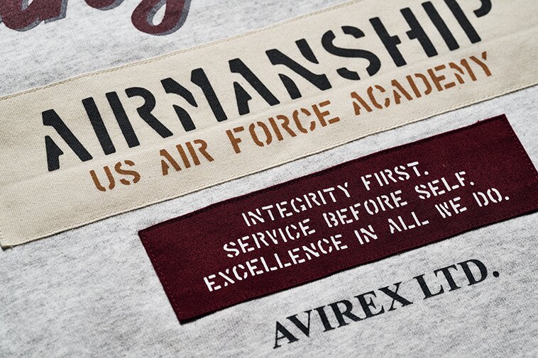こちらはコロラド州の空軍士官学校をモチーフにしたデザイン。ミリタリーウエアでも、ネームラベルとしてよく見られるコットンテープを使い、AVIREXらしい無骨なスタイルを演出している。細かく施されたステンシルプリントも雰囲気抜群だ。7590円