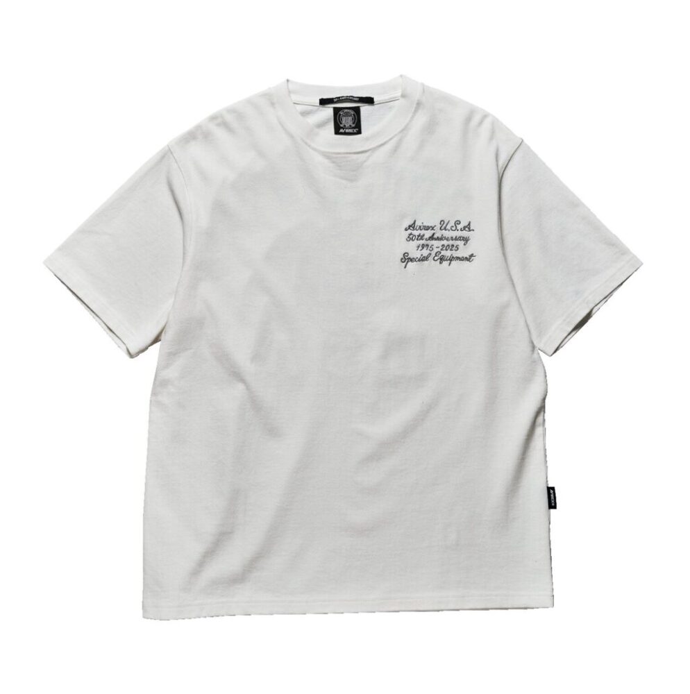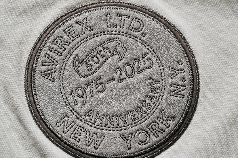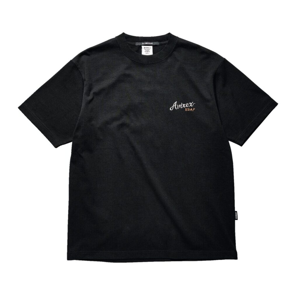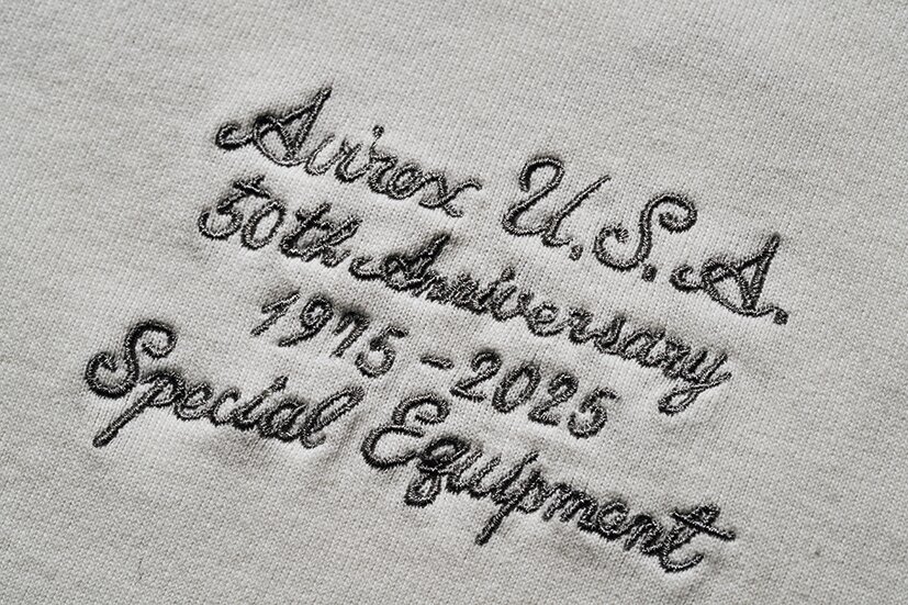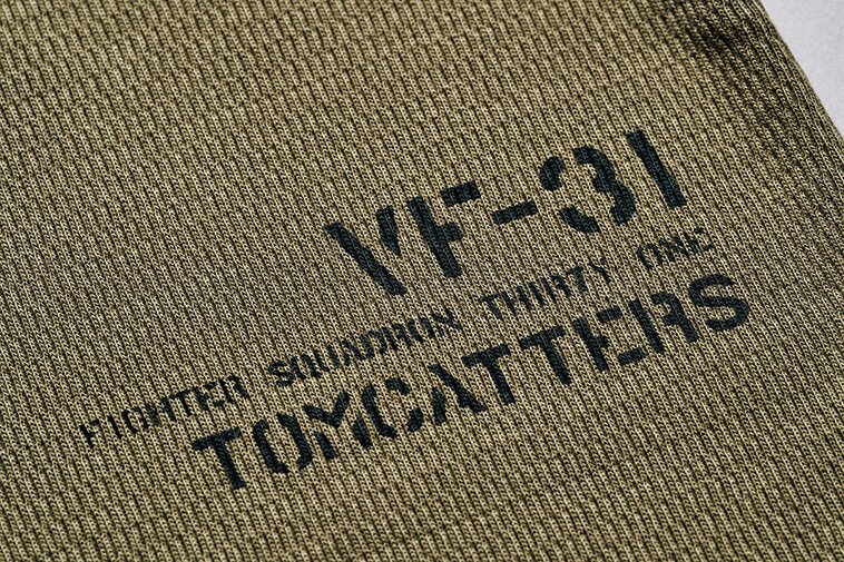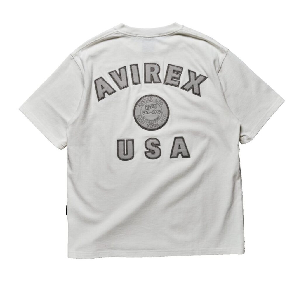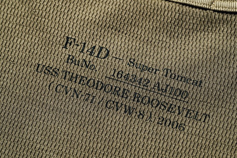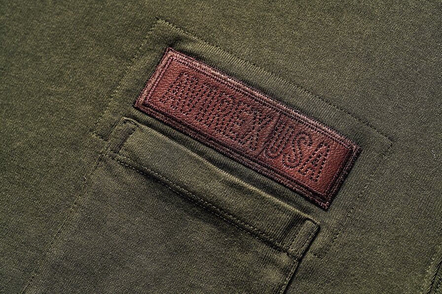 こちらはコロラド州の空軍士官学校をモチーフにしたデザイン。ミリタリーウエアでも、ネームラベルとしてよく見られるコットンテープを使い、AVIREXらしい無骨なスタイルを演出している。細かく施されたステンシルプリントも雰囲気抜群だ。7590円
