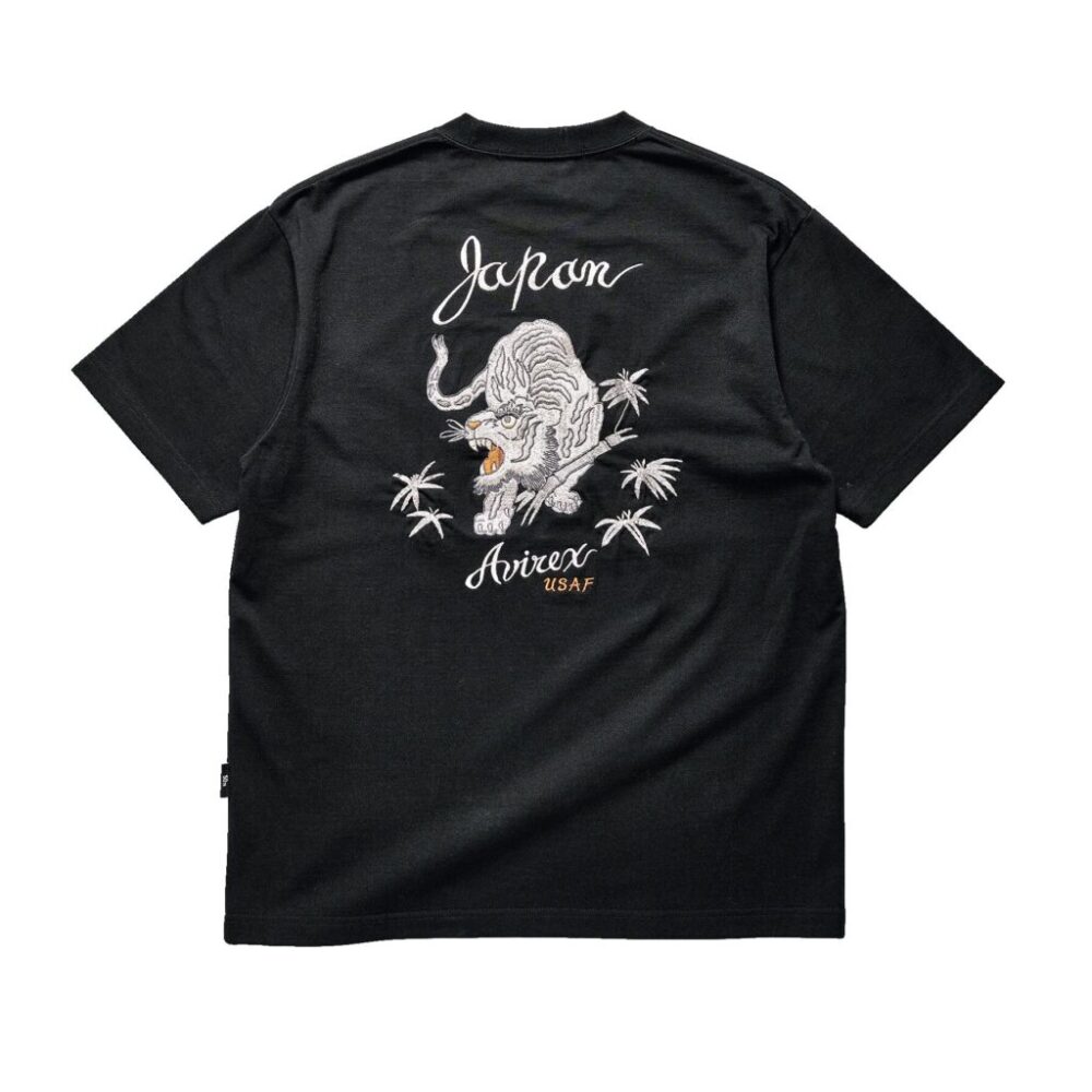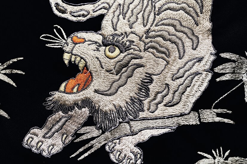スカジャンなどで知られる、アメリカ兵向けのスーベニア刺繍から着想を得た、個性際立つ一着。運針で毛並みまで表現されたホワイトタイガーが黒いボディに鮮やかに映える。肉厚ながらポリエステル混素材で、速乾性に優れているのも嬉しい。8690円