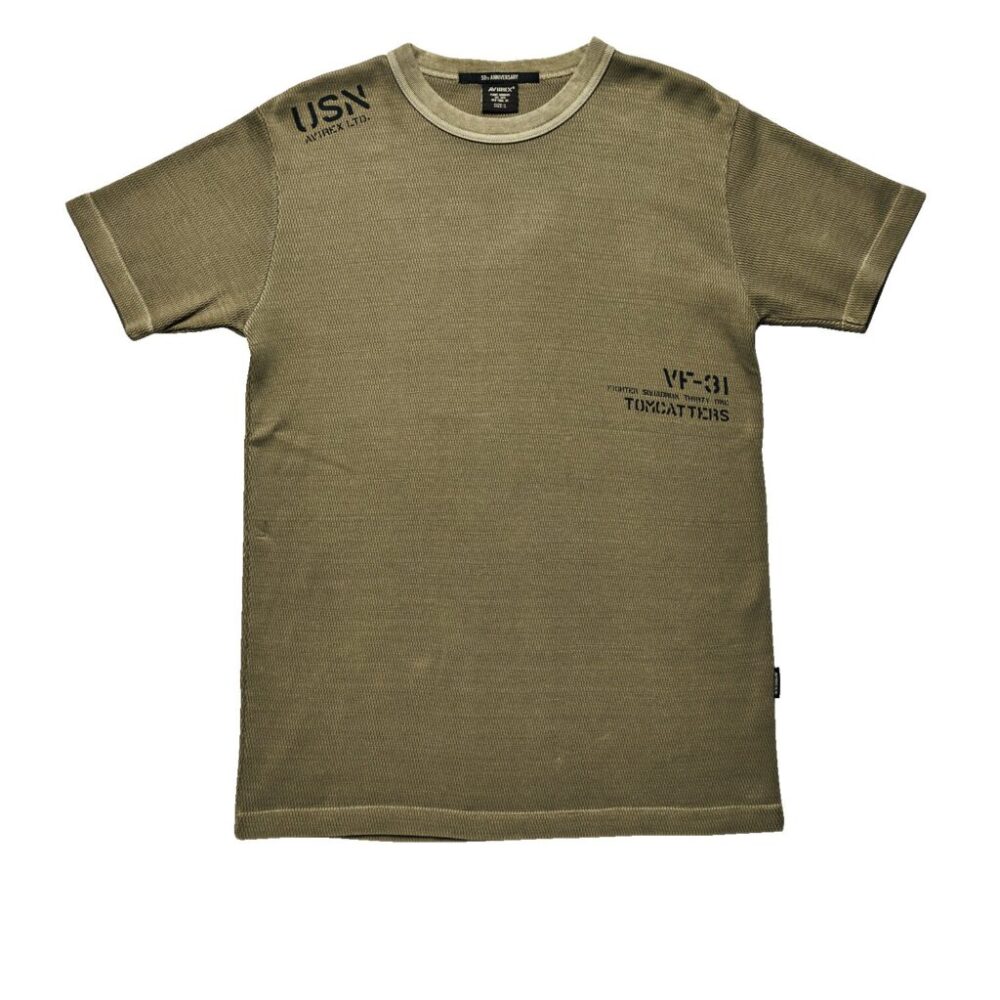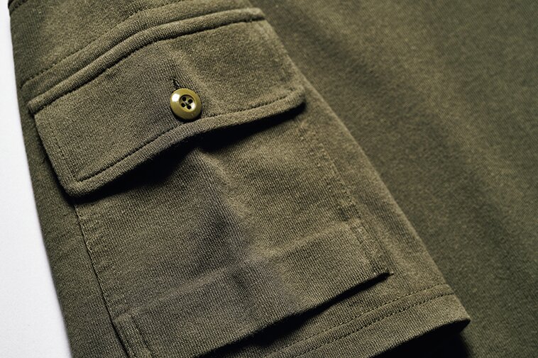保温性を高めるため凹凸状に編み、昔ながらの機能的素材であるハニカムワッフル構造の生地を採用。ムラのある独特な色合いは、顔料を使った特殊な染色加工によるもので、着込むほどに味わい深く褪色するのが特徴。随所に施されたステンシルプリントがミリタリーテイストを強調している。8250円
