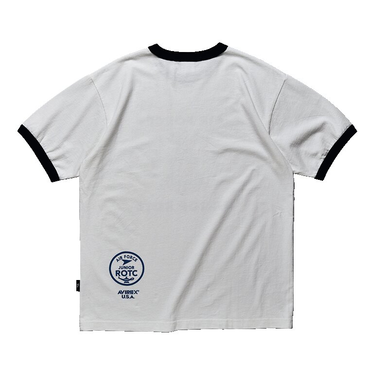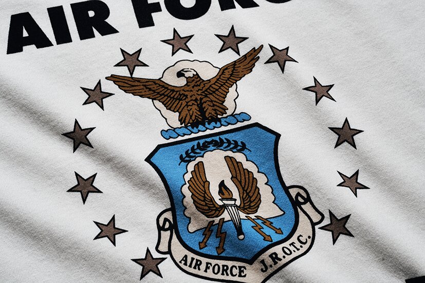 クラシカルなリンガーTシャツに、染み込みプリントを施したヴィンテージライクな一枚。米国空軍予備役士官訓練隊プログラムのジュニア部門をデザインソースにした、マニア心をくすぐるプリントが魅力。ボディはしっかりと目を詰めたヘビーウェイト生地で長年愛用してもヘタりにくい。7700円
