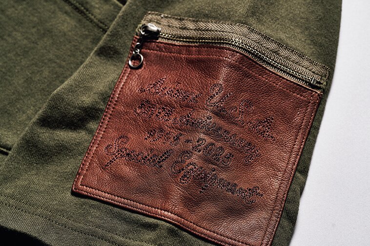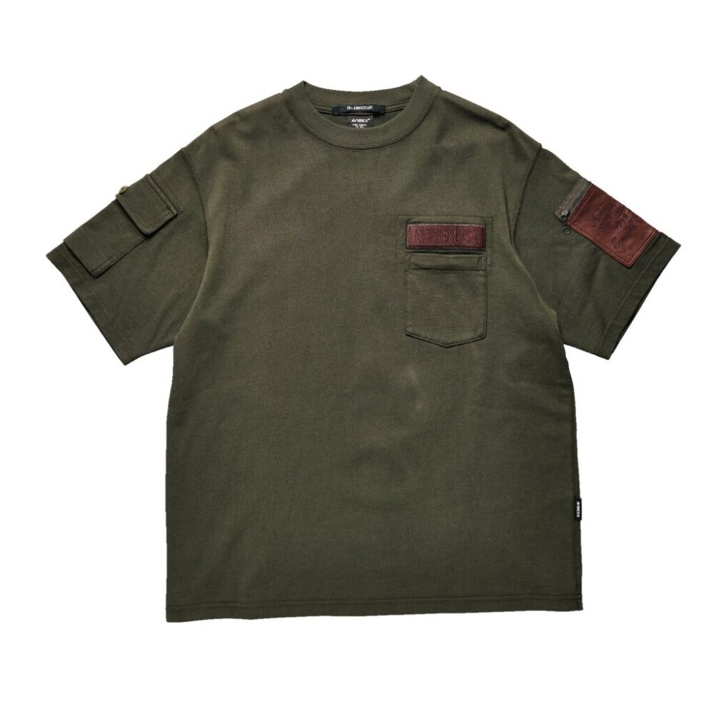 アヴィレックスで定番人気を誇るファティーグTシャツが、設立50周年を記念した特別仕様で登場。胸のネームプレートと左袖のポケットに味わい深いゴートスキン(山羊革)を使用し、ワイルドな雰囲気をプラス。肉厚のボディは度詰めした天竺生地なので、革と一緒にエイジングも愉しめる。1万9800円