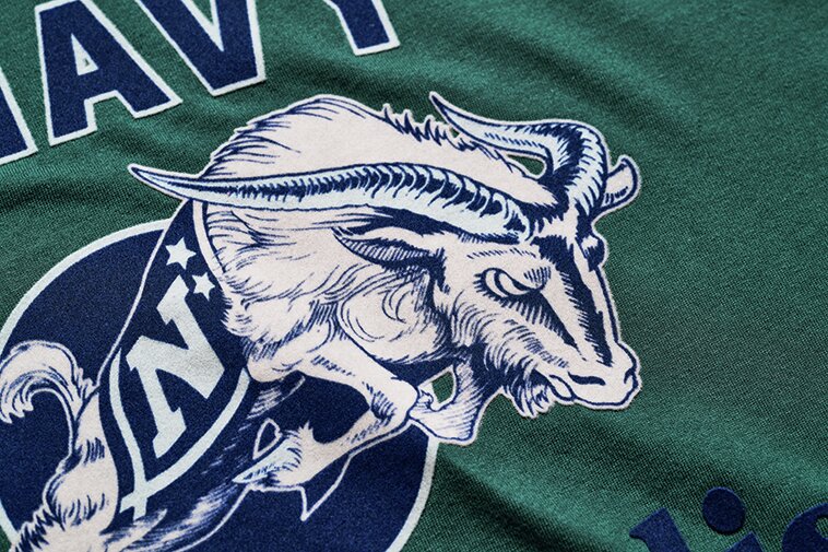こちらも肉厚さがウリのヘビーウェイト生地のTシャツ。通称「アナポリス」と呼ばれる米海軍の士官学校をテーマにしている。プリントは上質なフロッキーで表現しているため、学校のマスコットとして知られる山羊も迫力ある佇まいとなっている。8250円