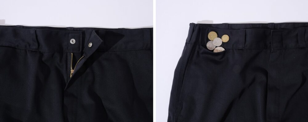 フロントはフックから耐久性の高いスナップボタンへと変更。表から見えない仕様とすることで、“874”の顔立ちを崩さないように設計した。さらに、右フロントにはクラシックなワークスタイルを彷彿とさせるコインポケットを配置し、細部にまでこだわりを込めている。
