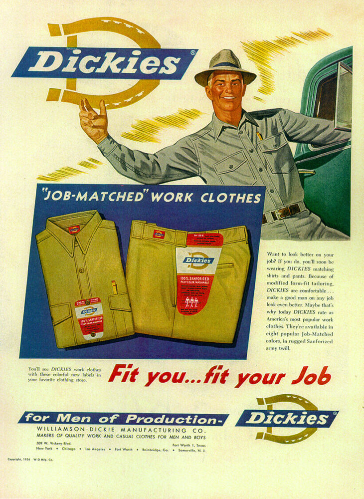 “FIT YOU, FIT YOUR JOB”(あなたにも、あなたの仕事にもフィットする)――1954年の広告で掲げられたこのコピーは、今なお「Dickies」のものづくりの根幹にある。アメリカ政府の要請により900万着以上の衣料を生産した第二次世界大戦時の実績や、1967年の発売以来、世界的なロングセラーとなっている“874”の存在がその信頼性を物語る。