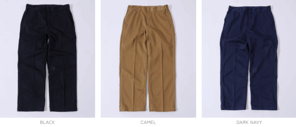 シルエットやディテール、雰囲気は、「Dickies」の定番モデル“874”がベース。ワークパンツというカテゴリにおいても原点かつ頂点とも言えるアイコニックな存在である。今回の別注では、太さのピッチを調整し、“874”よりもややワイドなシルエットを採用。ヒップまわりに余裕を持たせながら、裾にかけてわずかにテーパードを効かせた、癖のないバランスの良い一本に仕上げた。