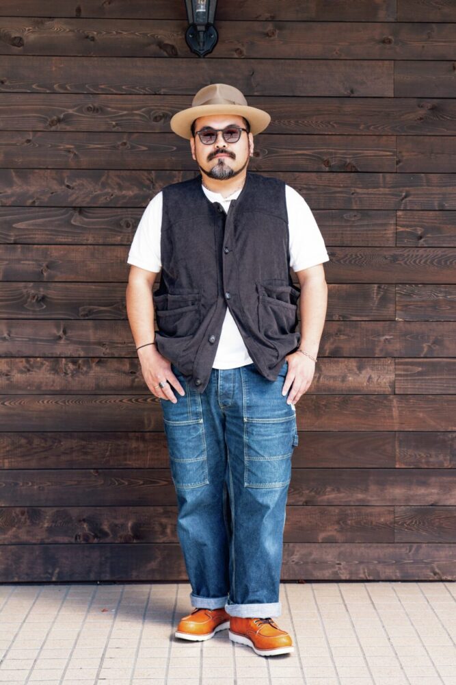 静岡県御殿場市にある大型アメカジショップで知られるバーンストーマーの、サングラスとハットがトレードマークの店長BOSSさん。薄手になりがちなこれからの季節は、ベストのレイヤードがおすすめ。ベスト、デニムともにササフラスのもので、足元はワークスタイルの王道アイテムであるレッド・ウィングを合わせることでワーク感をプラスした。