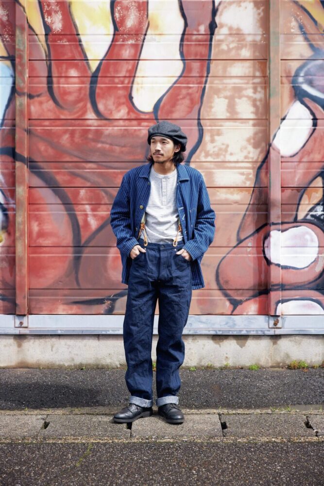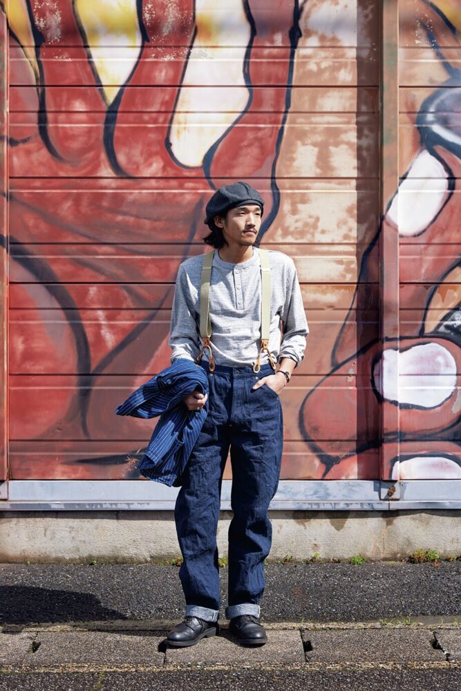 国内のアメカジブランドから海外ブランドまで幅広く展開しているろーぐす。あらゆるブランドのアイテムに対する豊富な知識を持つ同店が、今春提案するのは春らしい軽やかさにヴィンテージ感をプラスした着こなし。こちらのコーデも1911年から1915年まで製造されていた通称「No.3」を再現したウエアハウスのデニムパンツにオルゲイユのサスペンダーを合わせたクラシカルなスタイル。フルカウントのジャケットは羽織っても、手で持っても様になる。インナーに薄い色を持ってくることで軽やかな印象に。着用は楠大生さん