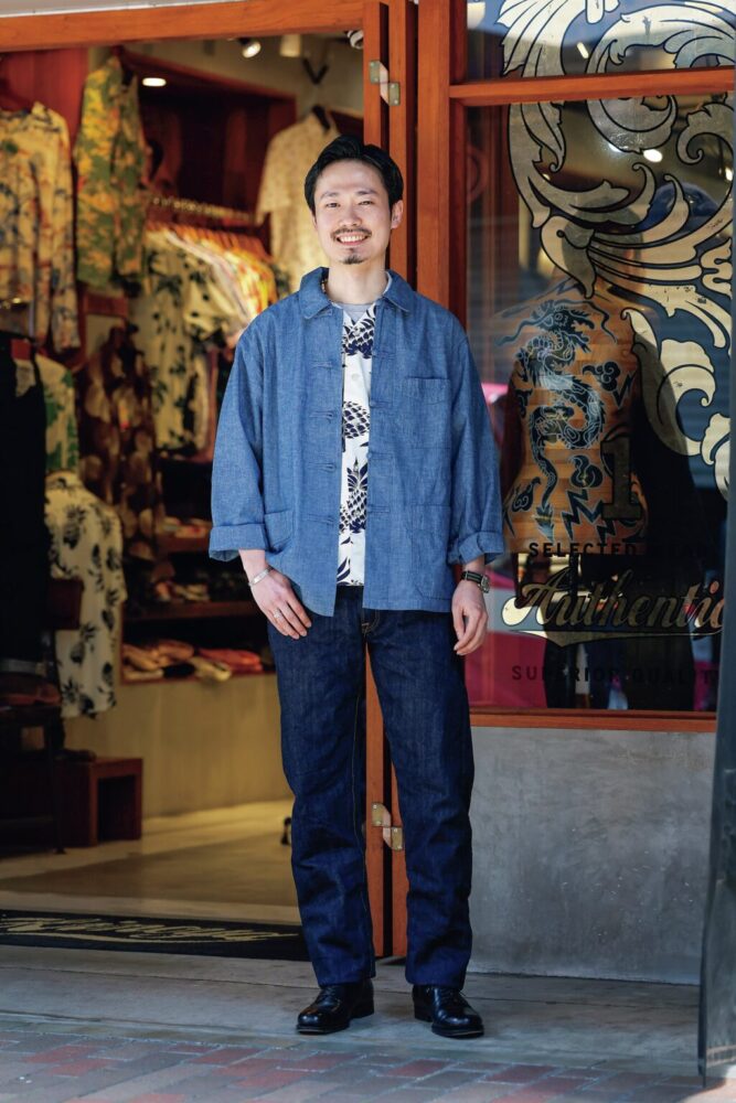 1992年に上野・アメ横の高架下にオープンした老舗カジュアルショップ「ヒノヤ ワン」。アメリカンカジュアルウエアをセレクトの主軸にしながらも、国内外で話題の人気ブランドを取り扱うショップとして知られている。そんな同店が提案するのがこちら。ワークウエアスタイルの定番であるシャンブレーシャツやデニムのコーディネイトでも少し捻りを加えることで新鮮さを感じさせてくれる。ブルーブルーのシャンブレーチャイナシャツにサンサーフ デュークカハナモクのコットンアロハをレイヤードし、清涼感を意識したスタイルは好印象だ。