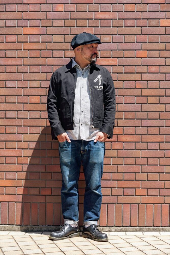 横浜ワールドポーターズ内にオープンして約22年。旧くから横浜に根付く、アメリカンカジュアルウエアをメインにステュディオ・ダ・ルチザンやフェローズなどへの別注アイテムやFM横浜、大橋ボクシングジム、横浜ベイスターズなど、地元横浜ならではの企業や団体などとのユニークなコラボレーションも人気。リアルに穿き込んだ15.5オンスのセルビッチデニムは横浜デニムのもの。トップスは職人の手によって仕上げられたメタルボタンが特徴のヘビーウエイトなヒッコリーシャツの上から、今季人気のファーマーズジャケットを羽織ったヒースの王道ワークスタイルを見せてくれた店長の池ヶ谷さん。