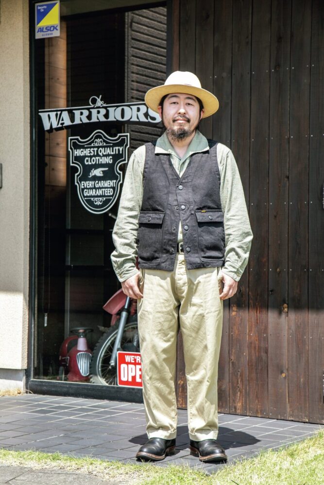 来年20周年を迎える老舗セレクトショップのザ・ウォーリアーズ。ザ・ウォーリアーズが提案コーディネイトのポイントは襟付きのシャツを使うこと。王道から少し外すというか、紳士的な要素を取り入れるのがザ・ウォーリアーズ流なのだ。ウエストライドのグリーンチェックのガンプシャツをメインにトロフィークロージングのランチャーベストを組み合わせて大人っぽいワークスタイルに。THE H.W. DOG&Co.のパナマ帽を取り入れることで、より紳士的な印象になる。濃い色と薄い色の使い方はぜひ参考にしたい。
