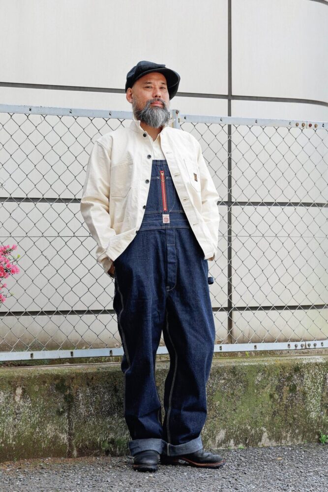 日本屈指の歓楽街として知られる東京新宿歌舞伎町にあるジャンキースペシャル。赤テープのファスナーポケットがフロント中央に配されたデニムオーバーオールはヘッドライトのもの。トップスに羽織るように着用したホワイトのジャケットはセーラーモクのワークコートでインディゴとホワイトの組み合わせが清涼感のある爽やかなコーディネイトに仕上がっている。
