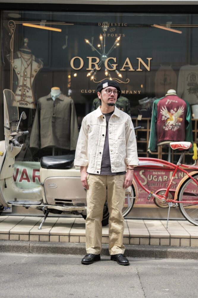 仙台駅から徒歩10分という好立地に佇むアメカジセレクトショップのオーガン。国内外のブランドを数多く取り扱い、本物のアメカジスタイルを楽しめる店として人気だ。そんなオーガンが提案するのは、本物を取り入れながらも固くなりすぎないカジュアルスタイルだ。メインはクッシュマンの1st 大戦モデルジャケット。10oz.のヘリンボン生地を採用しており、シャツ感覚で着られるのがいい。軽やかな色合いのウエアハウスのTシャツとチノパンツを合わせて春っぽさを演出。THE H.W.DOG&CO. のベレー帽とウィールローブのブーツで甘くなりすぎないのも◎。