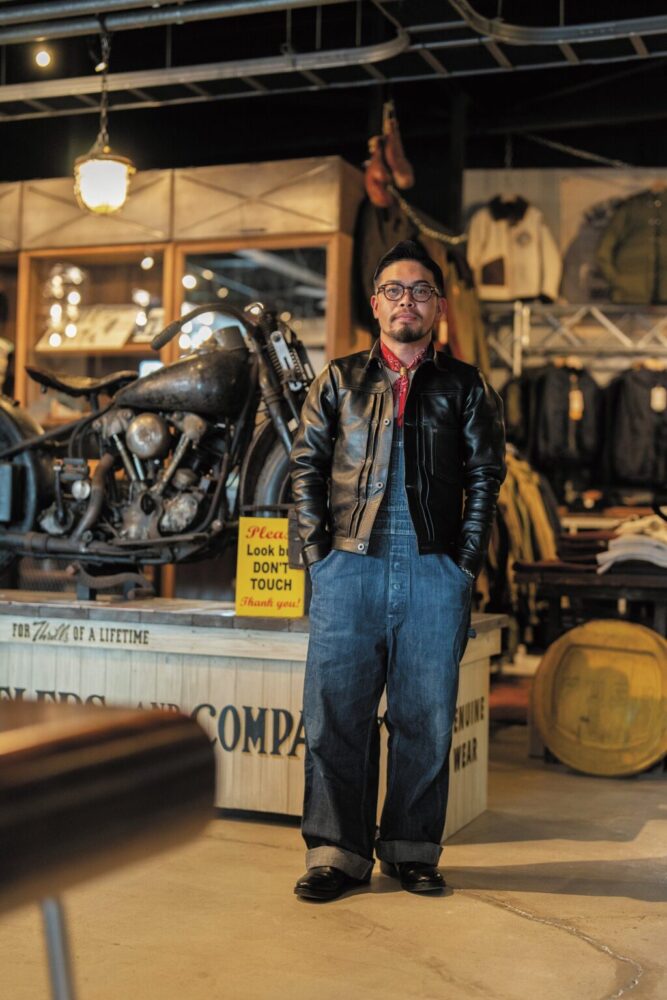 東北自動車道の古川ICを降りた国道4号線沿いに突如現れる2階建ての大きな黒い建物がウルフパックだ。国内外のアメカジブランドはもとより、バイカーズアイテムも充実。2階にはレザー専用フロアを作り硬派な空間がその世界観を醸し出している。最近年代を問わずレザーアイテムが人気ということで、今回はレザーを取り入れたコーデを提案。’40年代のLeeのカバーオールを解体し再現したジェラードのオーバーオールに、同ブランドのホースハイドのレザージャケットを羽織ったスタイル。重くなりがちな組み合わせだが、レッドのバンダナがアクセントになってとてもバランスがいい。ブーツは茶芯のエンジニアを組み合わせた