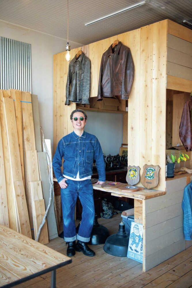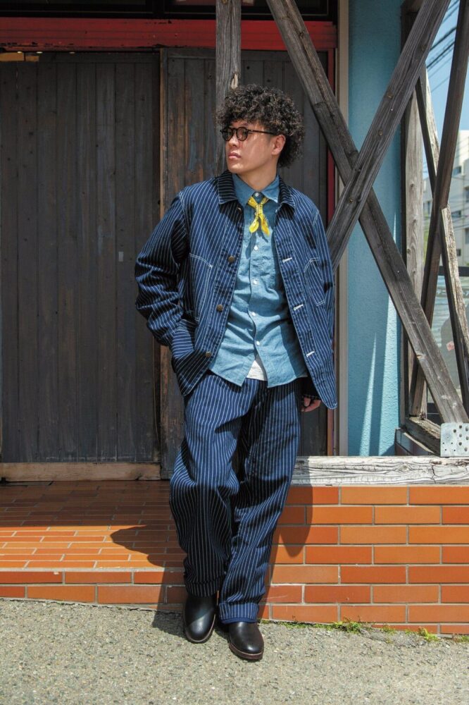 山口県柳井市にあるアメカジセレクトショップ「トップ」。店内の床や、什器など自ら制作するDIYの域を超えたリアルワーカーの林さんが提案するのはデニムのセットアップコーデ。実際に作業着として着ることで、日常使いとは違うヒゲやアタリが付くが、タウンユースにも取り入れたい。デニムならではの風合いとことん楽しめるスタイル。