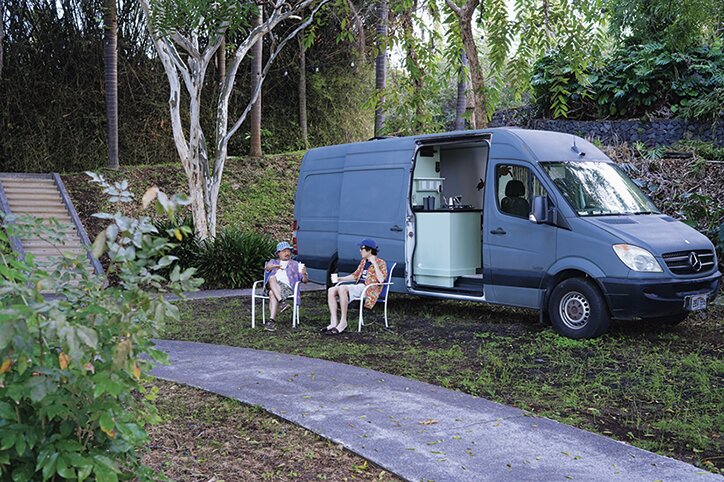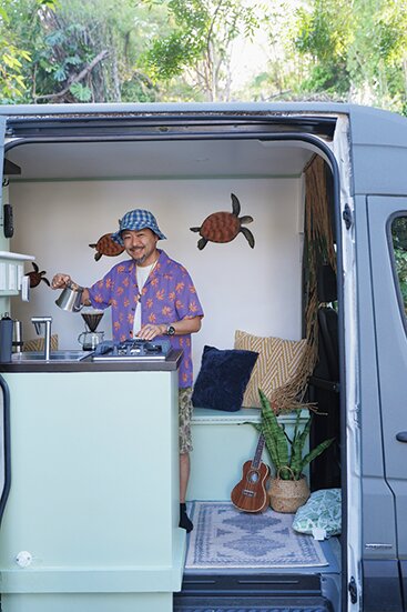 移動可能なキャンピングカーやドームハウスなどの宿泊施設も用意。キャンピングカー前で味わうモーニングコーヒーは格別だ。