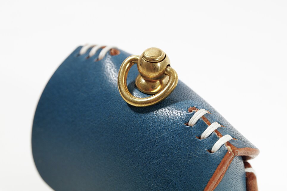 ストラップを装着するためにブラス製のDカンが付く。別売りストラップだけでなく、カラビナやキーリングにも対応。