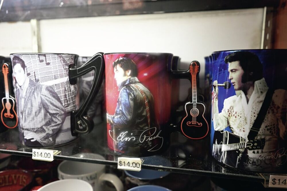 エルヴィスのマグカップ(14ドル)は、ここブルースシティ・ジェネラルストアの隠れた人気商品。ハンドルがギターなのが洒落てる。