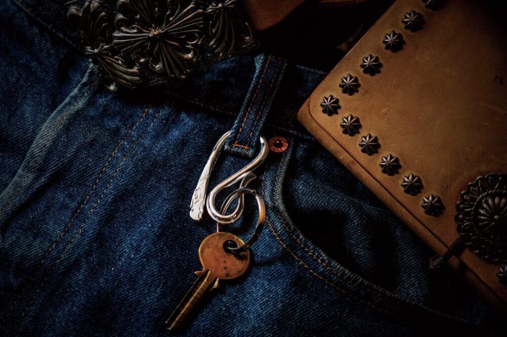 ジーンズを筆頭にボトムスのベルトループに通すキーフック。ここにもさりげなくイーグルヘッドが刻まれている。4万700円