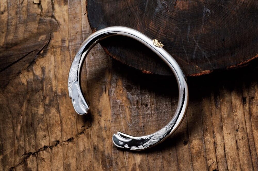 甲丸型をベースに両端にイーグルヘッドがデザインされたバングル。ワンポイントでゴールドの太陽が付けられる。8万4480円