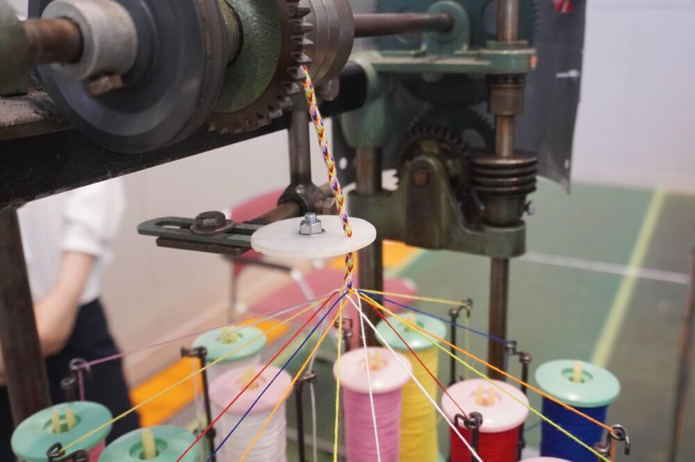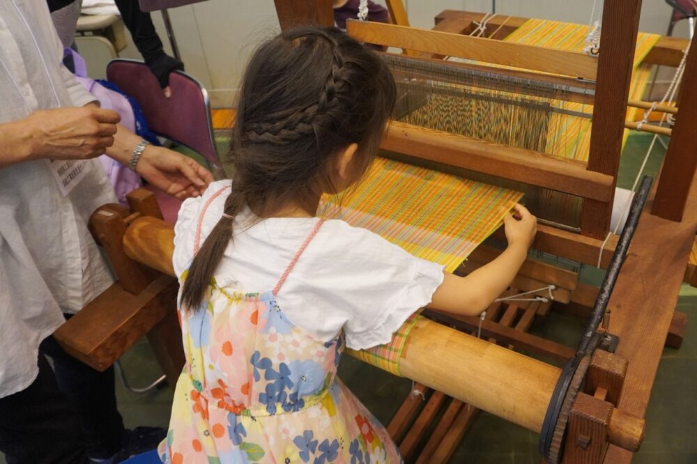 また会場には、「製紐機(せいちゅうき)」や「手織機(ておりき)」といった機械を実際に操作できる体験コーナーが設けられ、織物の製造過程を体験することができる。