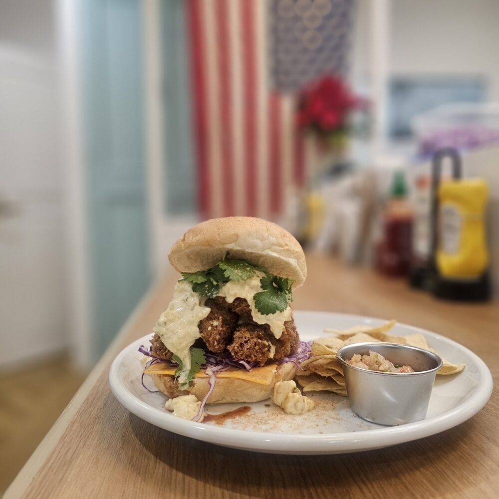 2023年12月、長野県飯田市にオープンしたアメリカン居酒屋。アメリカ文化が好きな店主が趣向を凝らした店内とメニューが揃う。バーガーは8種類をそろえ、「TEX-MEN」1,650円は、自家挽きパティにアボカドのマイルド感、チリコンカンのスパイシー感がアクセントに。
