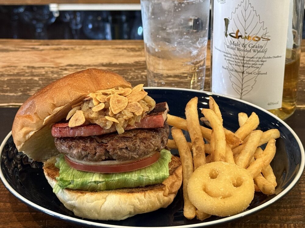 本格的なハンバーガー屋とBARを一つにした「GEORGE’S BARger」は1960年代のアメリカの雰囲気がコンセプト。 天然酵母のバンズ、ビーフ100%の超粗 挽きパティを使用したバーガーは絶品。写真は最近の人気メニュー「ガーリックベーコンバーガー」と隣町秩父で蒸留された「イチローズモルト」のハイボール。