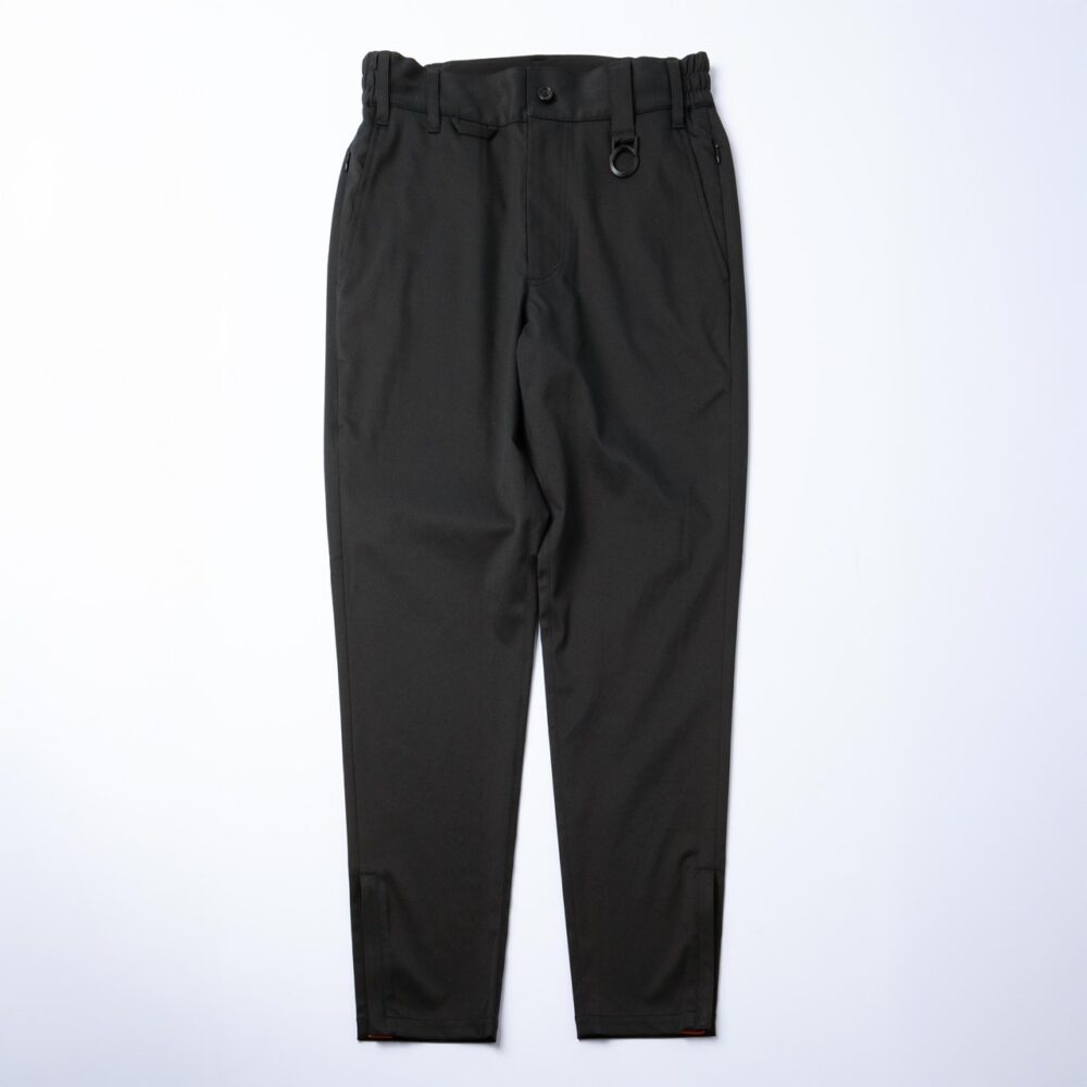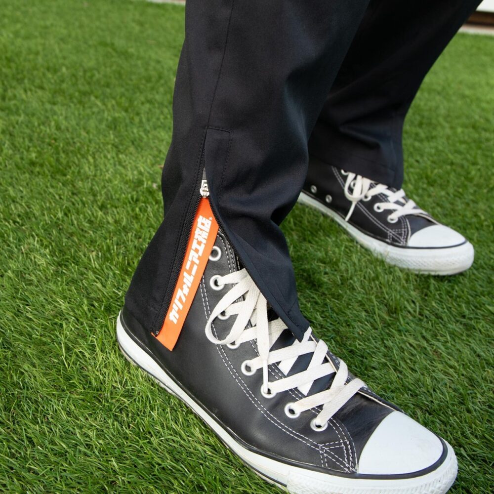 裾にスリットファスナーを設け、靴に合わせて調整可能。ロゴとオレンジのアクセントカラーで足元にもデザイン性を加えている。