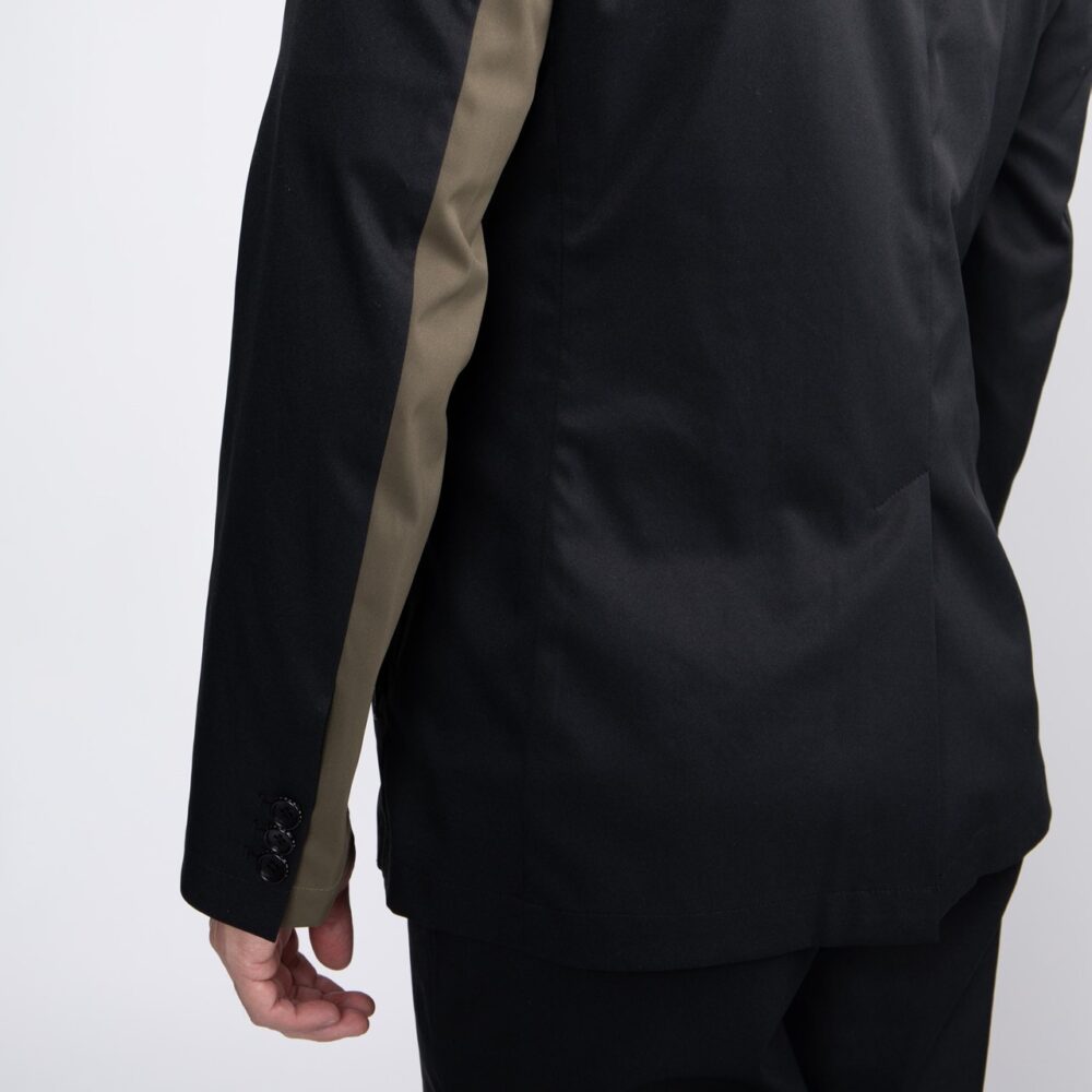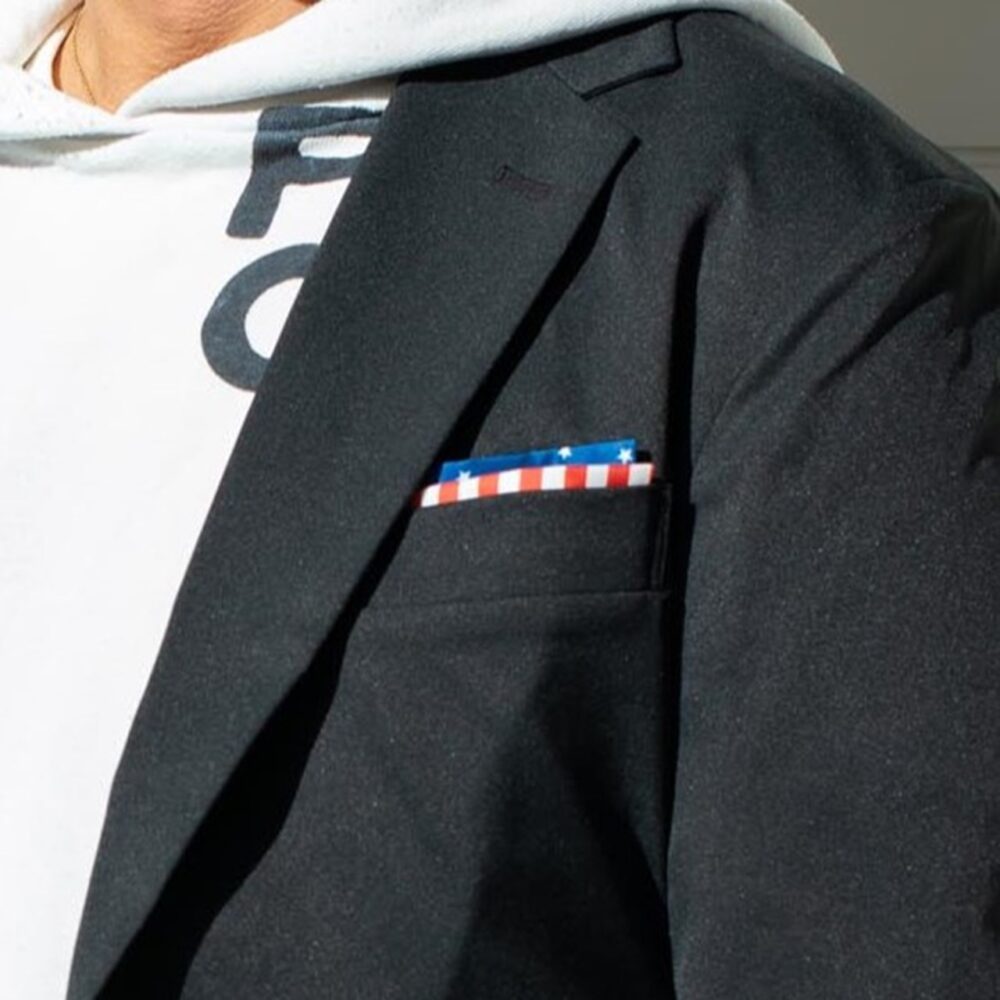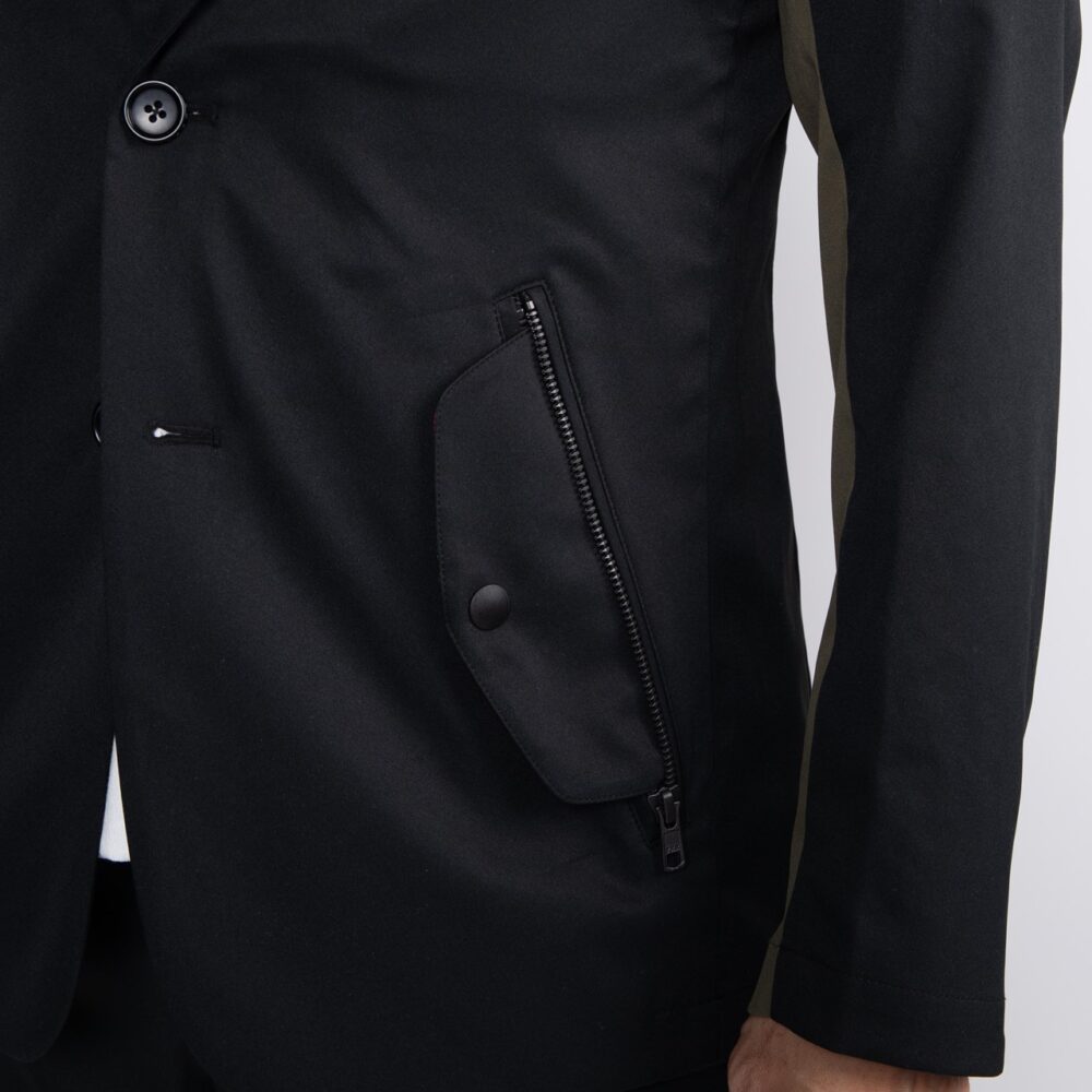 フェイクチーフやフラップ裏に星条旗パターンを配色。ジャケット左袖にはオリーブのバイカラーを採用し、遊び心をプラス。