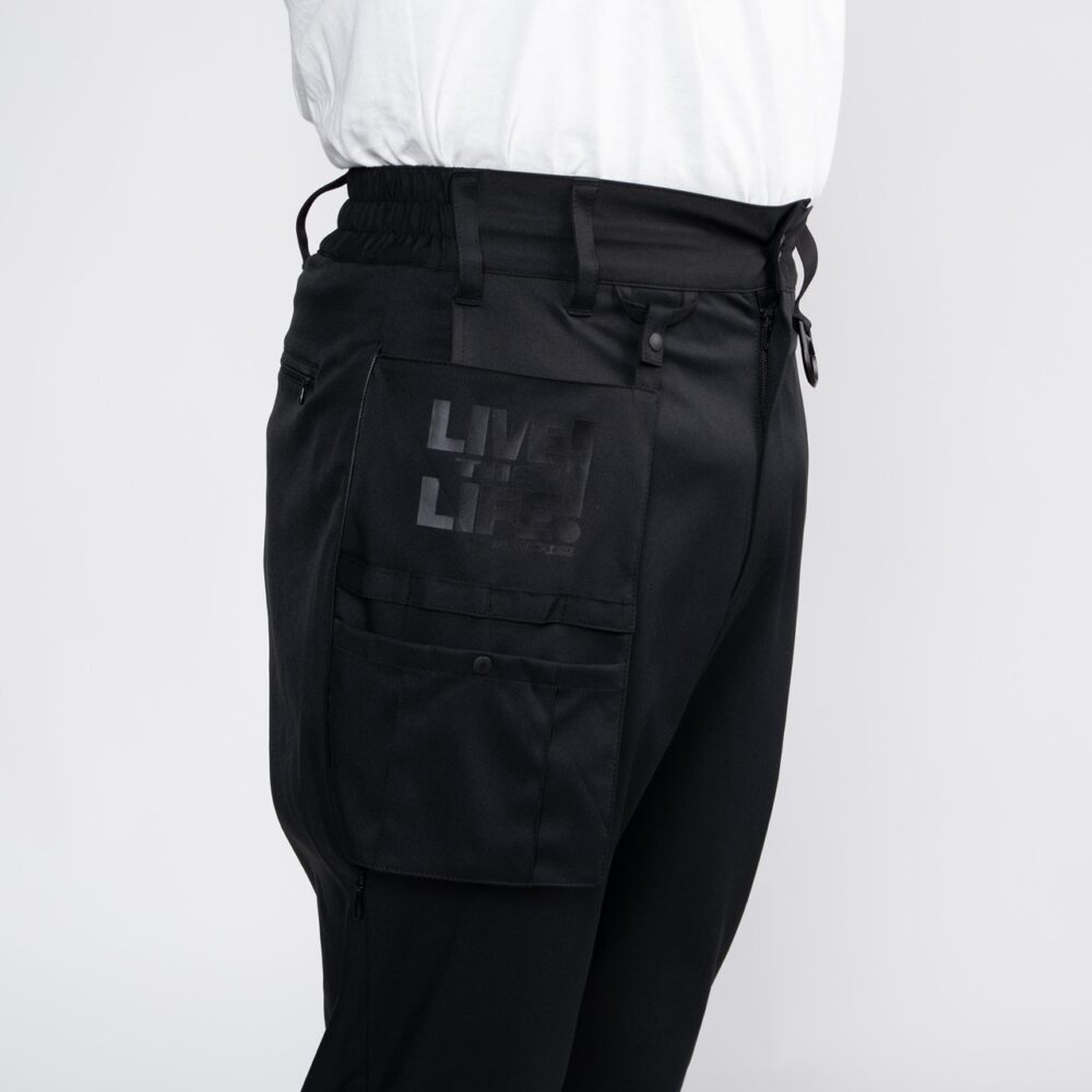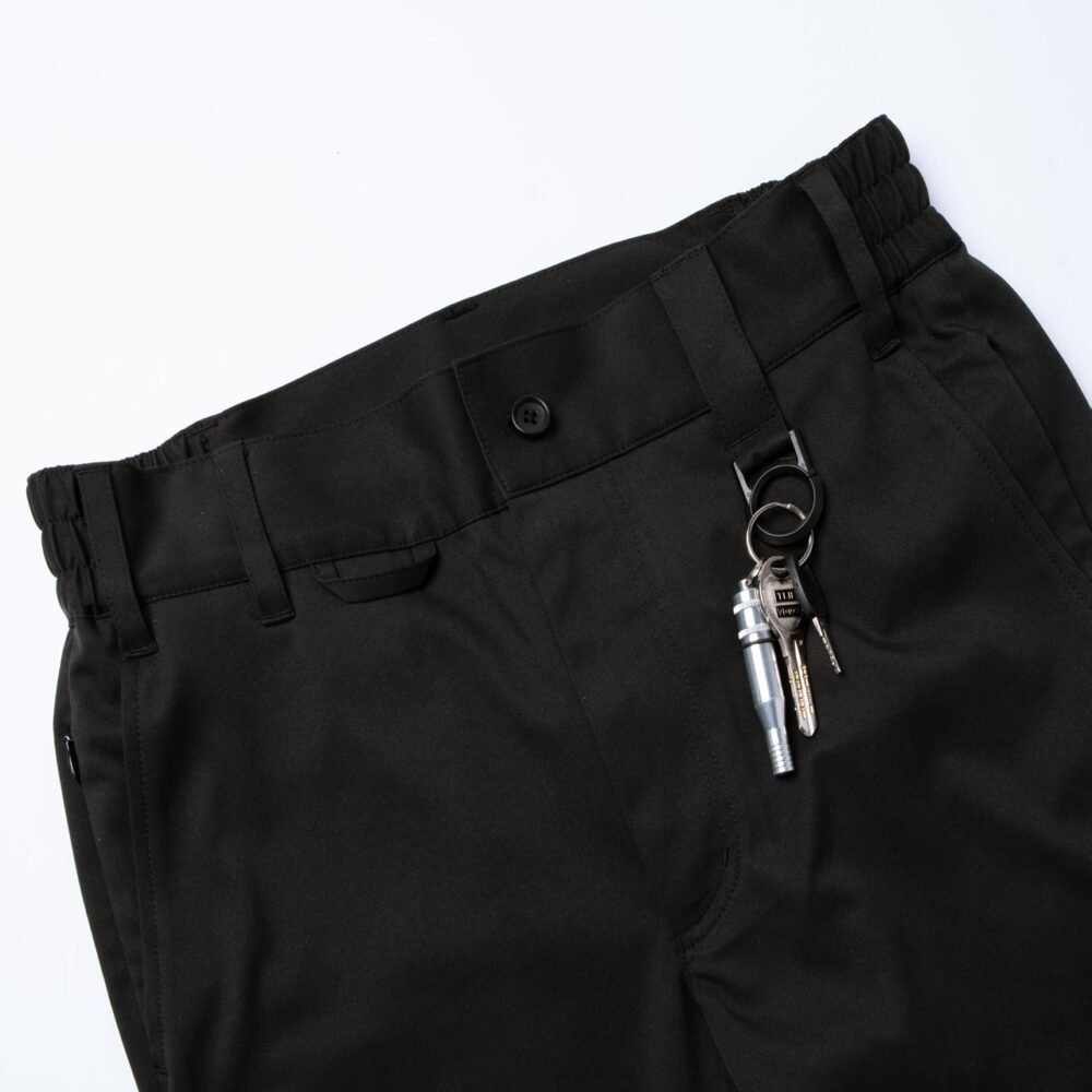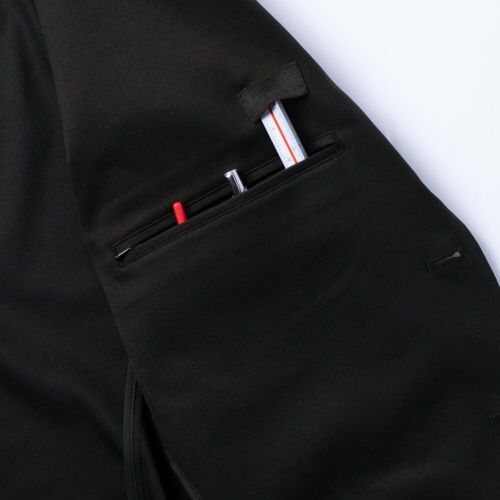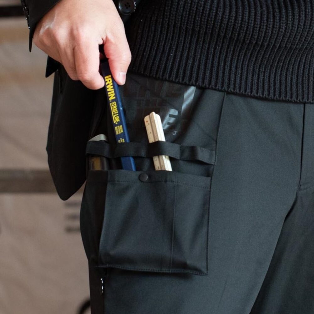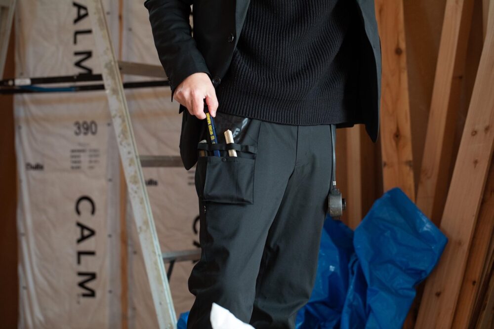 住宅デザインに関わる業務は多岐に渡り、施主との打ち合わせ、地鎮祭の立会い、展示会出展、現地調査、現場確認、現場監督業務などが挙げられる。そうしたさまざまなシーンに対応できるよう、見た目だけでなく機能性に優れたギミックを搭載した。レーザー距離計や三角スケール、ペンなどが収納できるようポケットの大きさや配置位置を調整。右ポケット横には隠しポケットを設け、スナップボタンで外付けできる小物入れを内蔵することで、工具によるパンツのシルエット崩れを防ぐ設計とした。