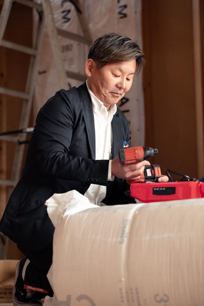 設計者目線で機能性にこだわった。現場で活躍できるようギミックを多数搭載。特に内ポケットや外付けポケットの位置や使い勝手は何度も調整を重ねた。星条旗柄やバイカラーで遊び心を演出しつつ、地鎮祭などフォーマルな場でも着用できるデザインに仕上げている。