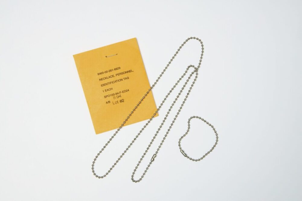 1994年製、アメリカ軍で実際に使用されていたドッグタグ用ボールチェーン。約60㎝のネックレスとして使える長さのものと、約10㎝の短いチェーンが1セットになっています。古着店「グレース」では、他の年代のものも複数ストックされているので、自分の生まれ年を探す楽しみ方も◎。1500円(グレース TEL03-6416-3457)
