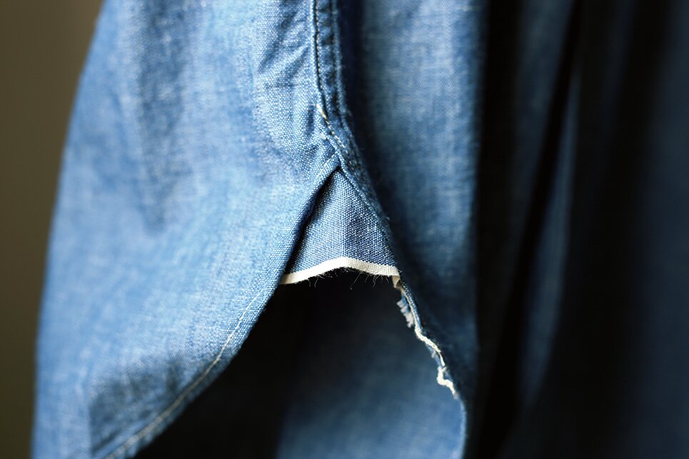 裾にはセルビッジ部分を使ったマチや切り残したカラ環が見える。マチ幅にゆとりを持たせて縫製することで可動性を高めた。