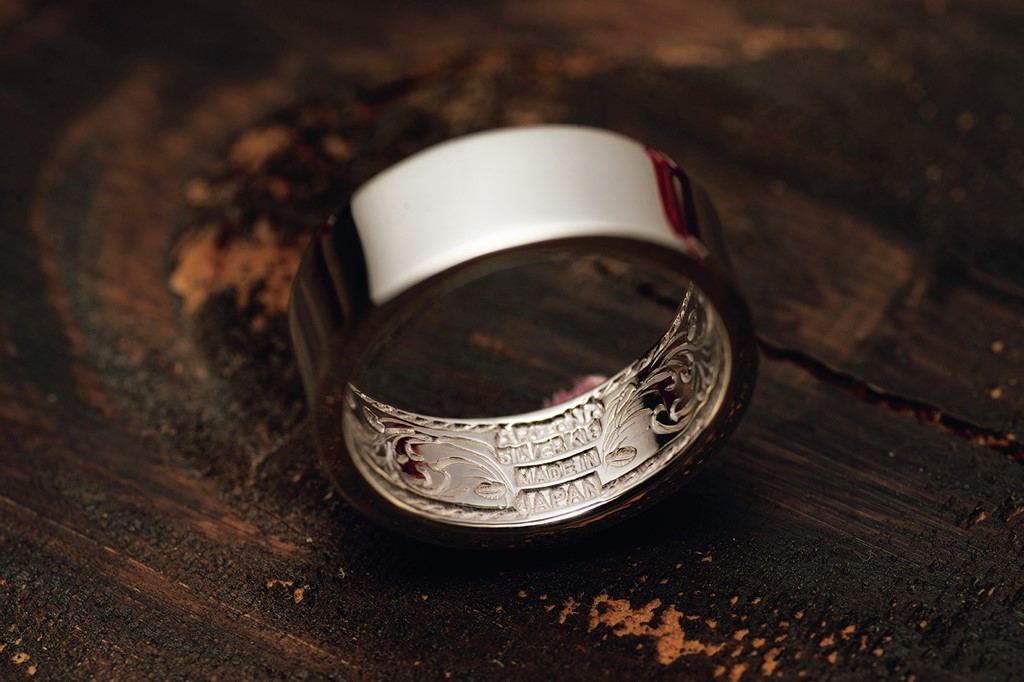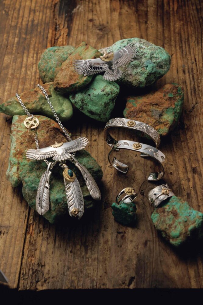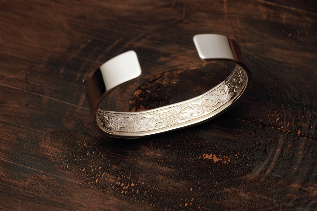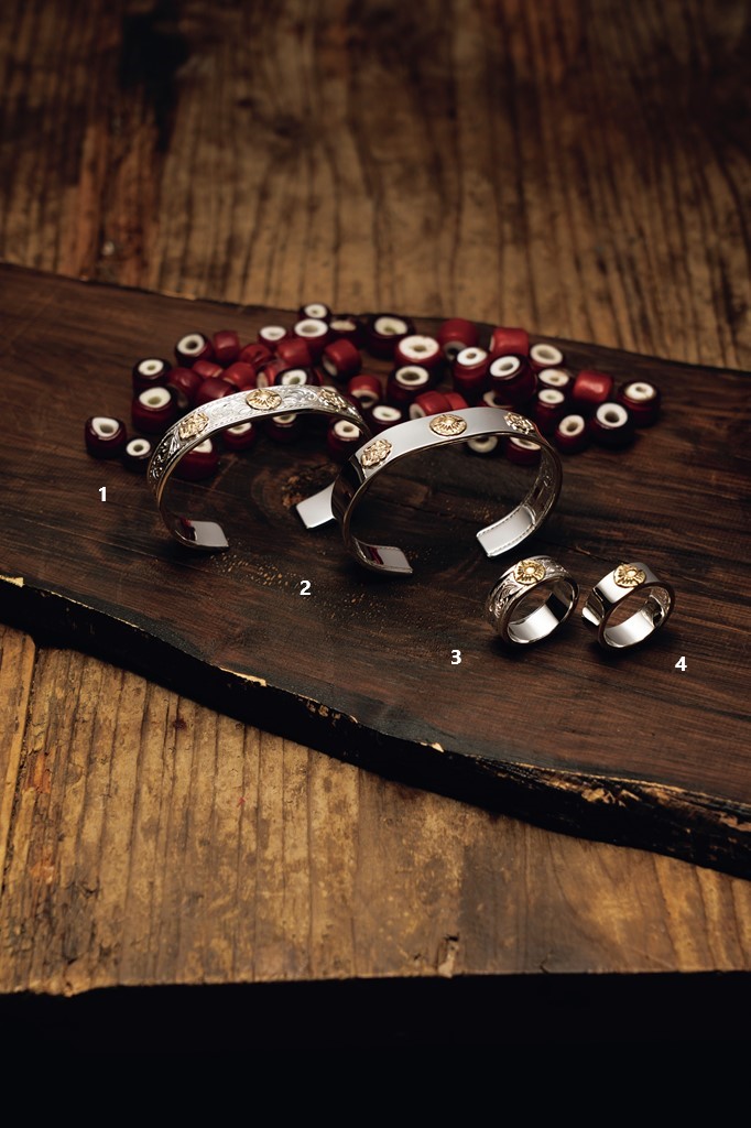 7月上旬発売の新作。ブランドを代表する唐草、太陽、花のモチーフを採用し、ソリッドなプレートにはリングとバングルにはともに高井技術を良いうする裏彫りが施されている。