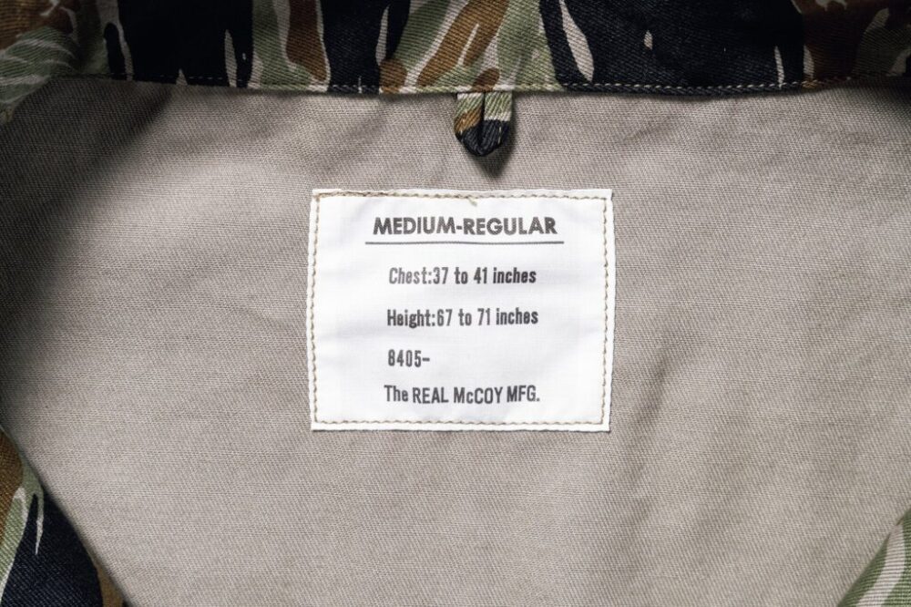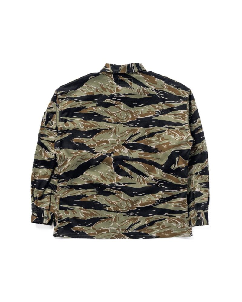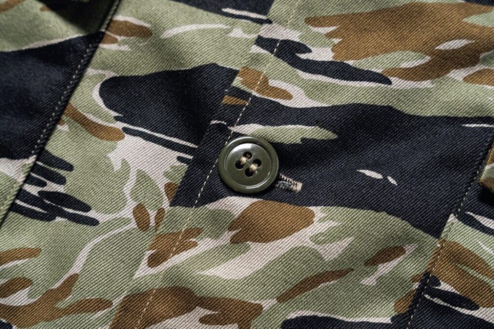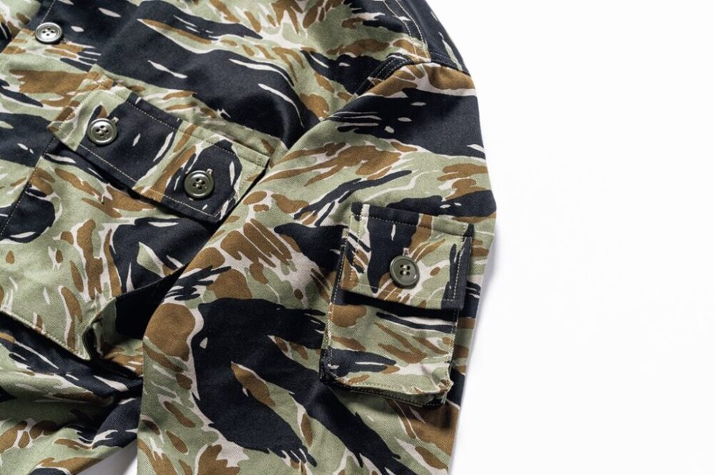 第一次インドシナ戦時、フランス軍空挺部隊に制定されたリザード迷彩が起源となり、1950年代末頃に南ベトナム軍で開発されたタイガーカモフラージュ。数多くのバリエーションが存在する中でもお玉杓子が 現れる柄である通称タッドポールを採用。両胸や左袖に配置されたボタン付きのフラップポケットにはマチが付き、ある程度の収容力も担保された亜熱帯気候向けのシャツジャケットとなっている。Size:S,M,L,XL Price:¥49,500