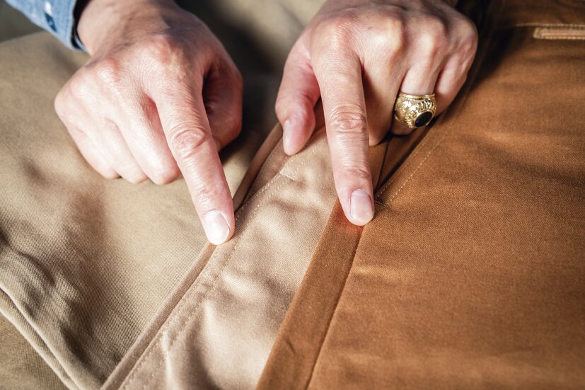 バズリクソンズで使用するチノクロスは大戦当時の生地を分析し、糸から忠実に再現。また縫製も大戦時同様に巻縫いと割縫いをモデルごとに使い分けている。